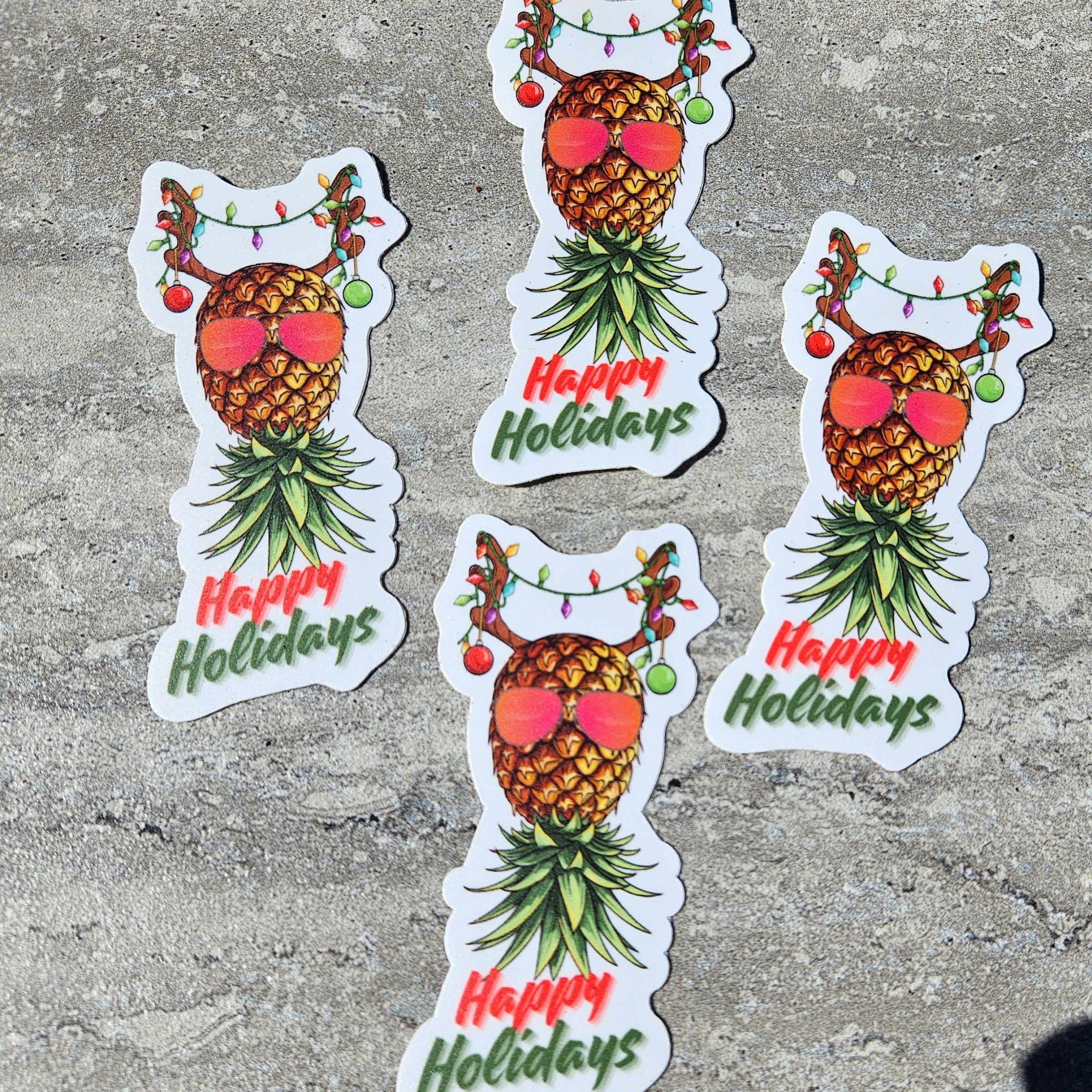 Happy Holiday Reindeer Waterproof Sticker - Upside-Down Pineapple 3"