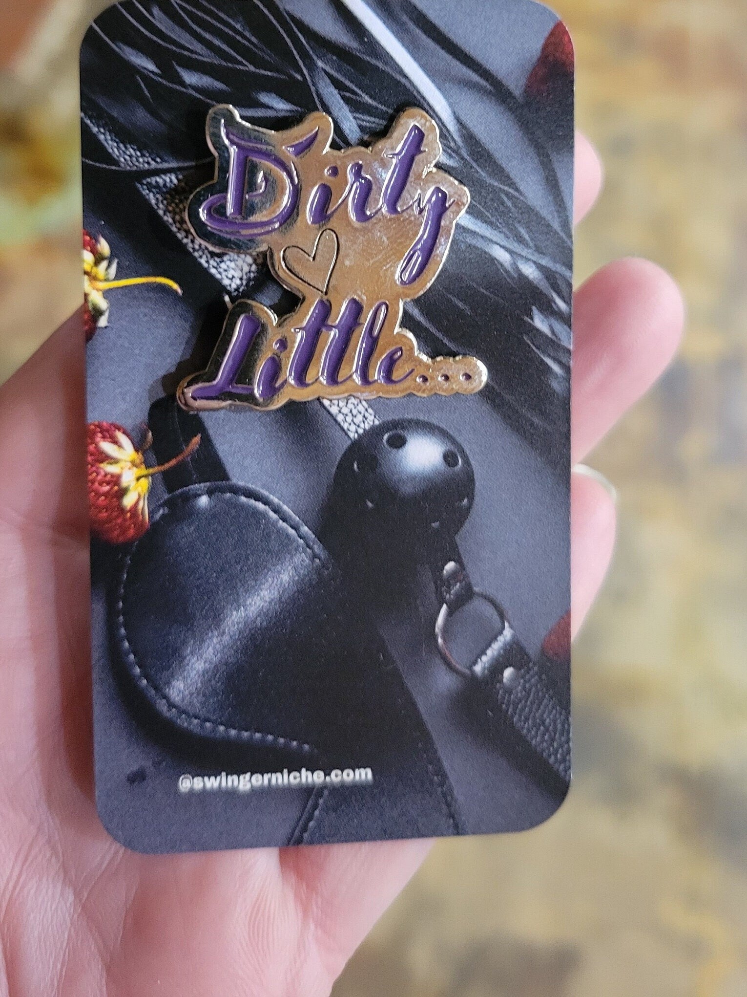 This is a 1" enamel pin with the purple statement "Dirty Little..." Express the kinky side of life.