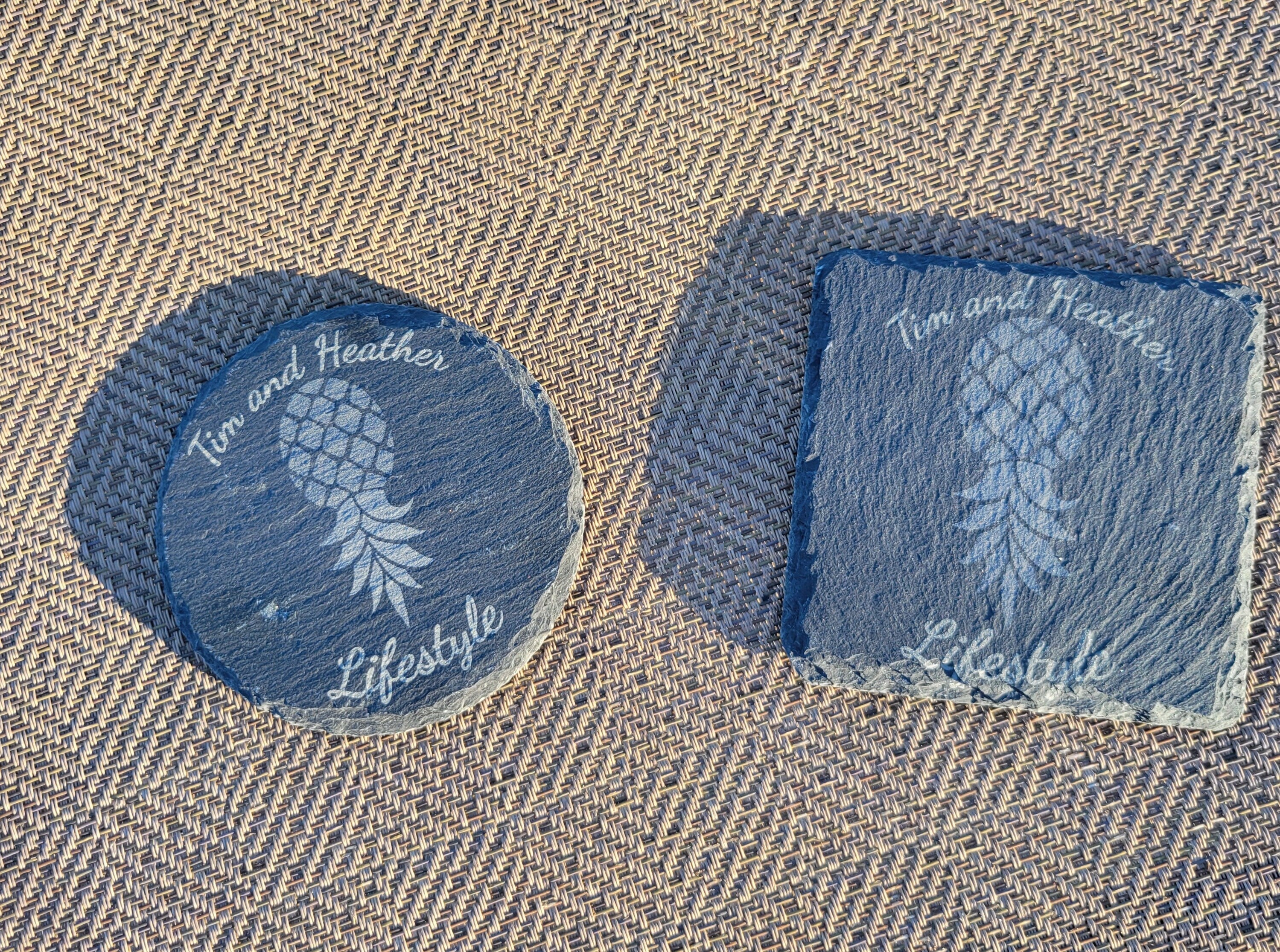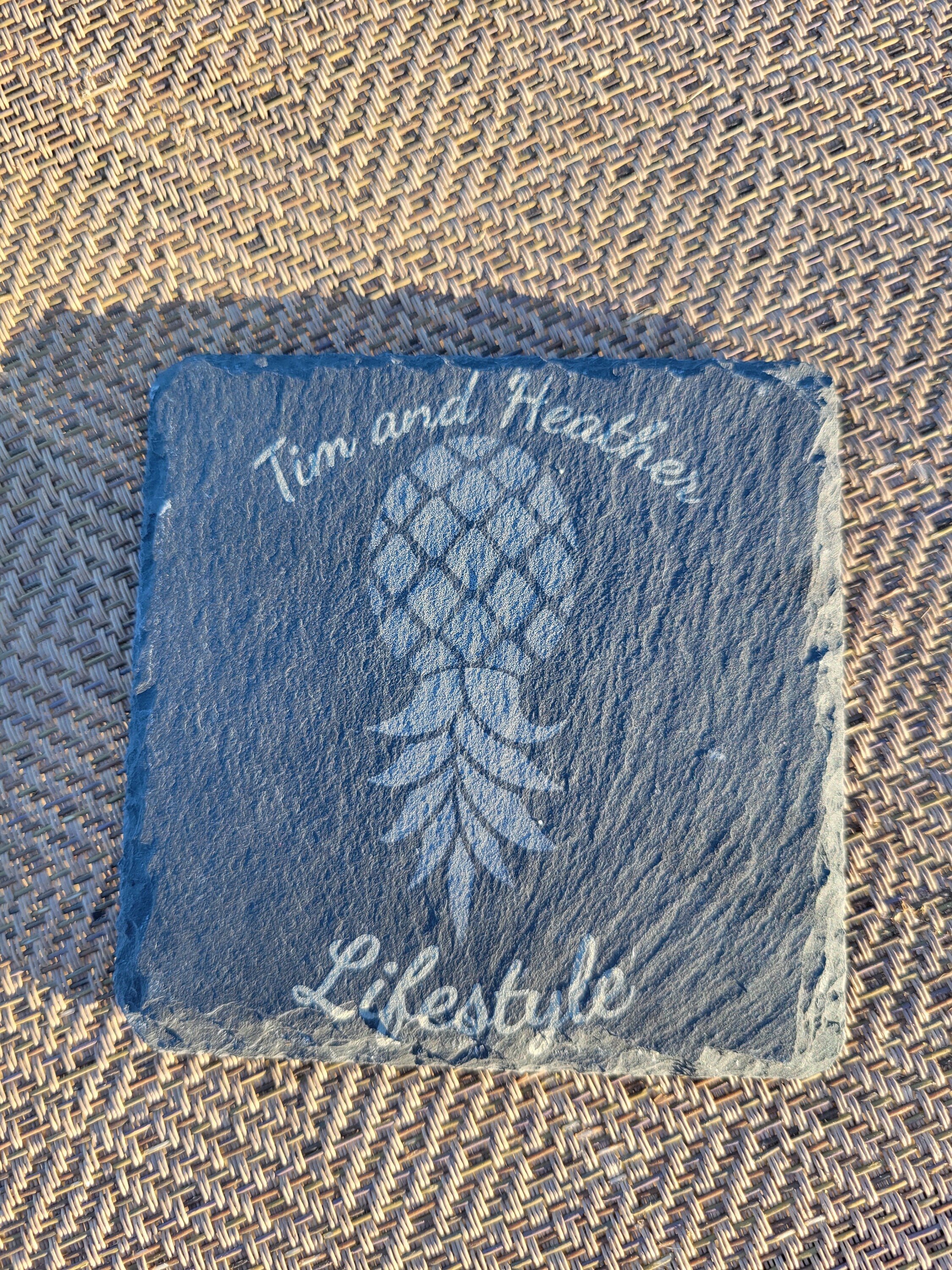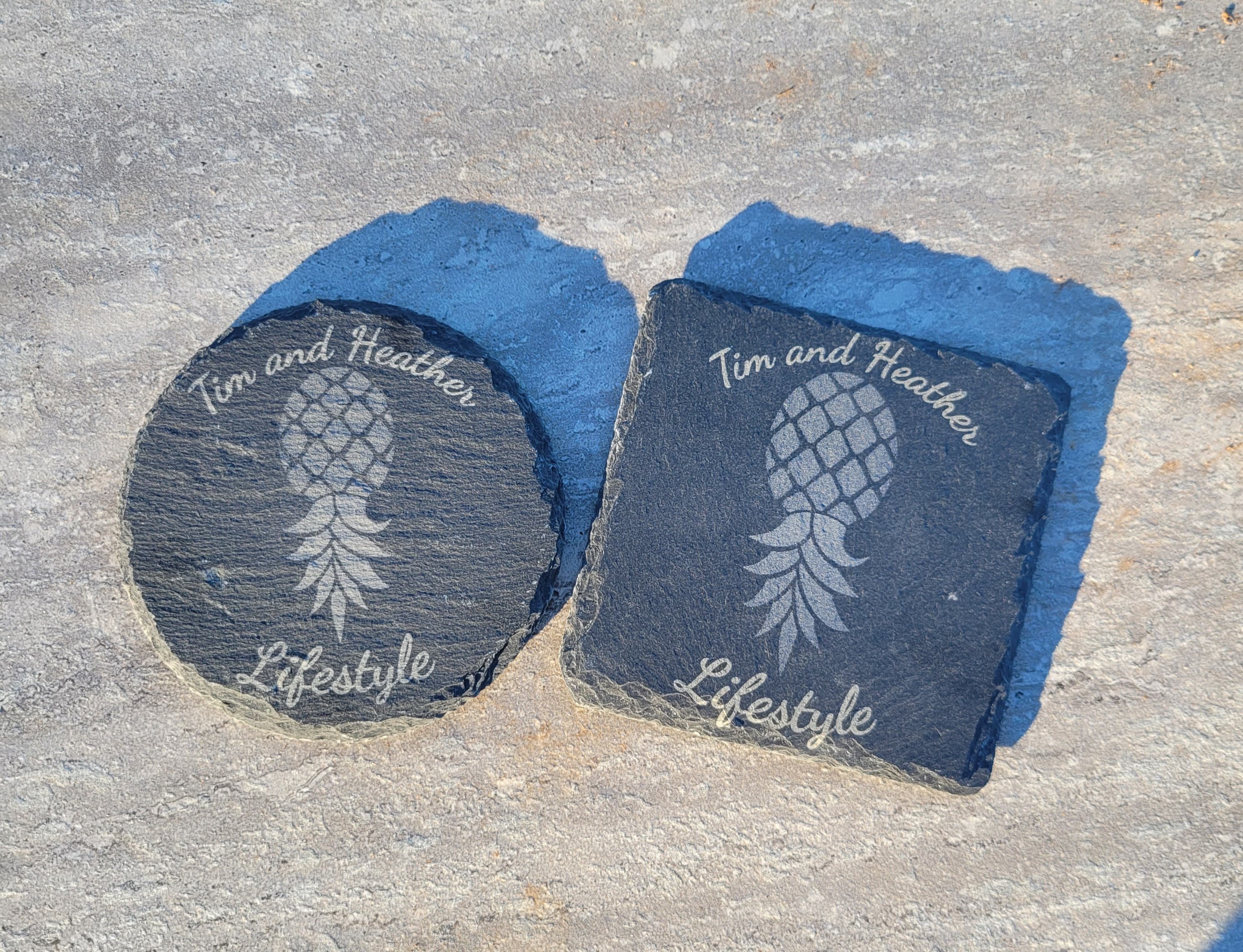 Customized and Personalized Slate drink coasters for drinks with a natural edge. They are perfect for the lifestyle to signify the love of swinging and the Swinger's Pineapple.