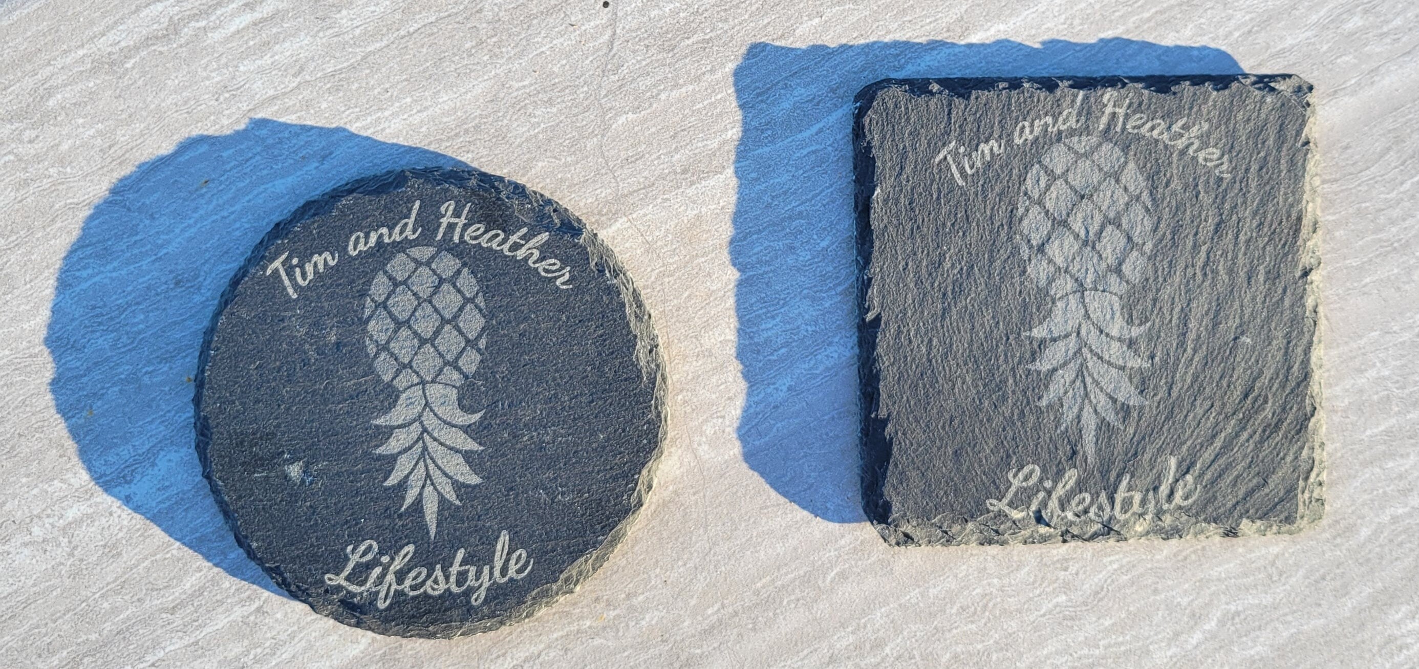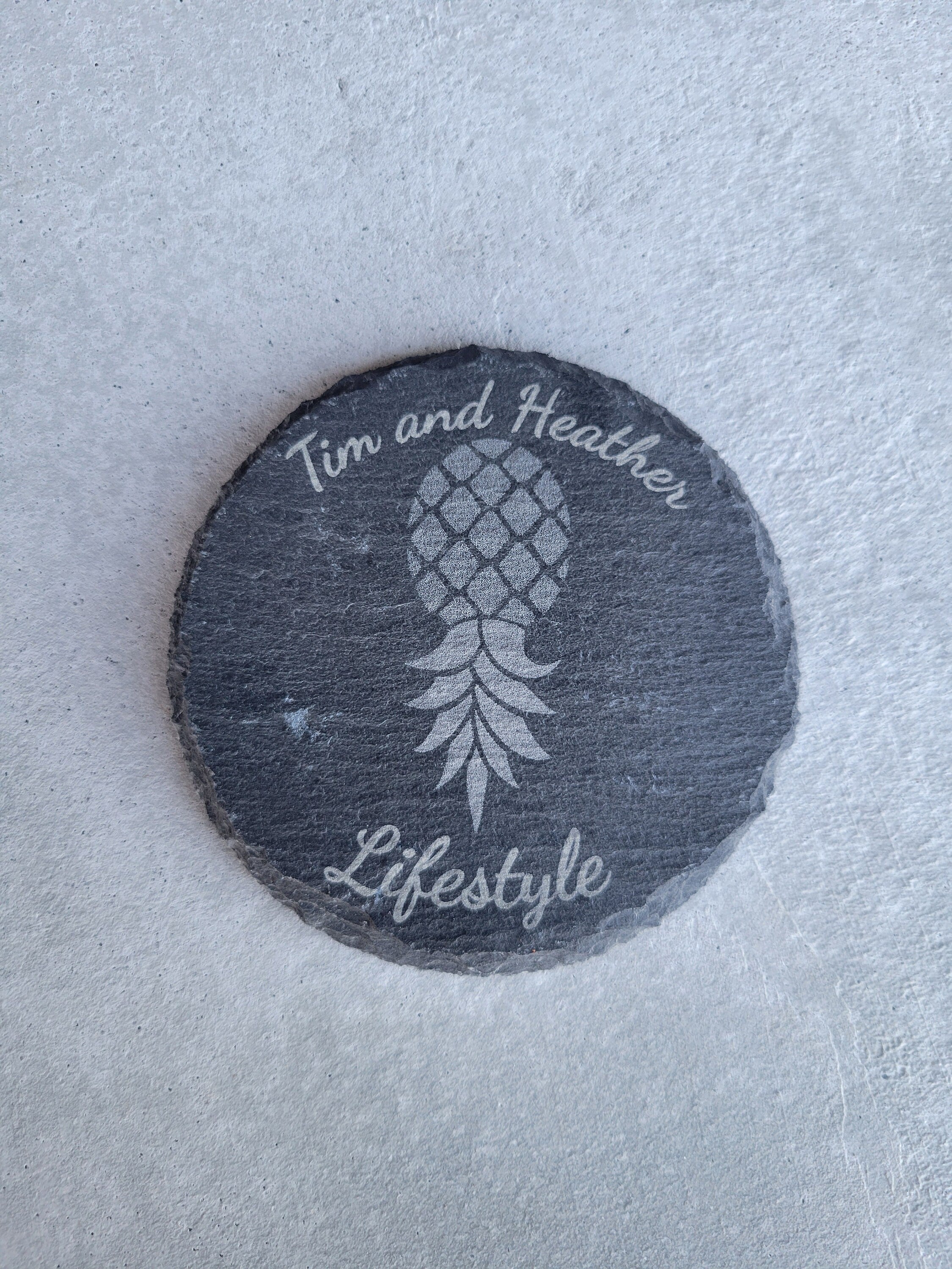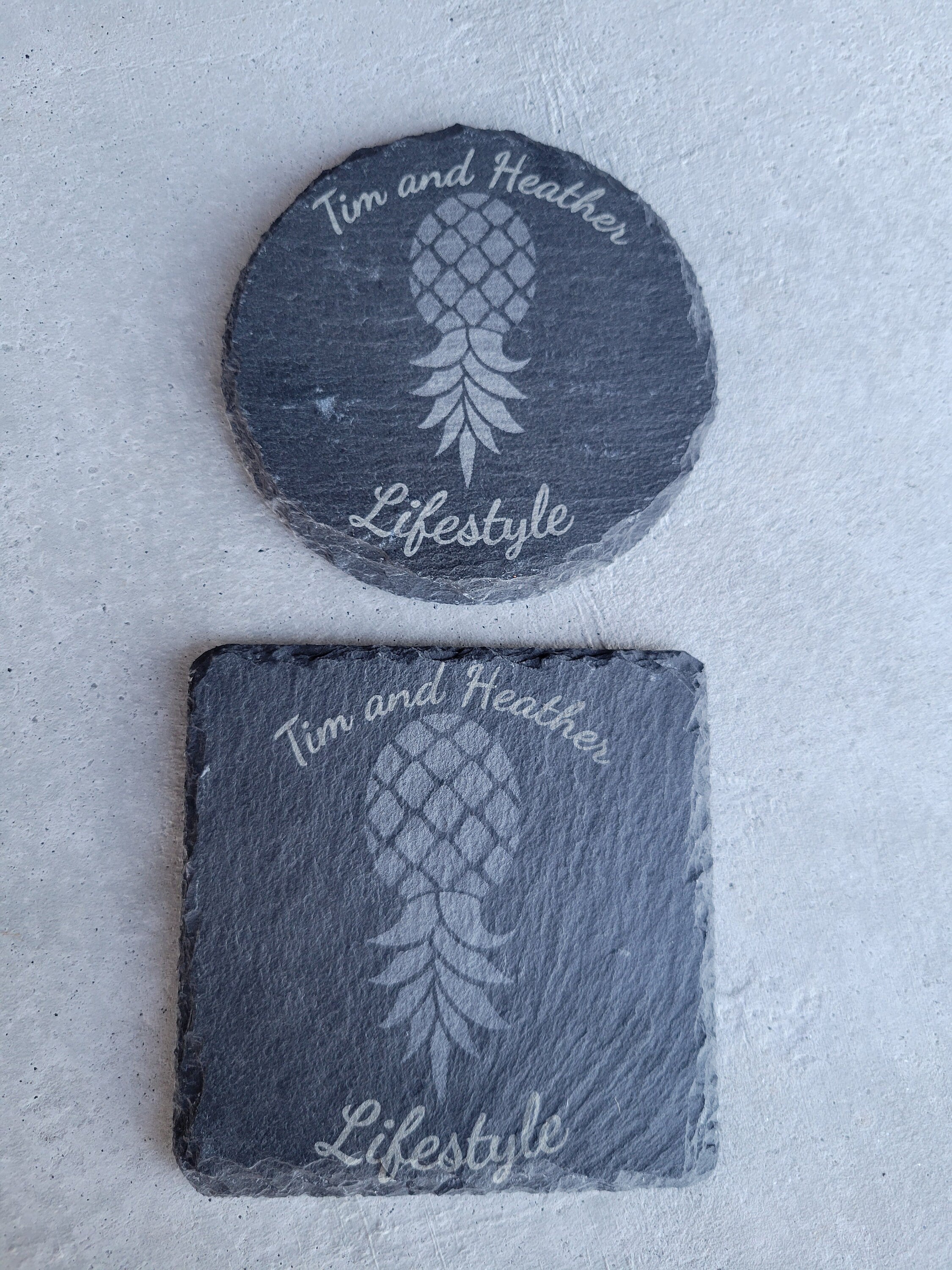 Customized and Personalized Slate drink coasters for drinks with a natural edge. They are perfect for the lifestyle to signify the love of swinging and the Swinger's Pineapple.