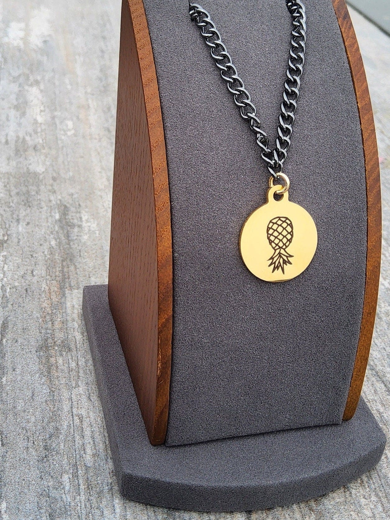This is a necklace that can be worn by anyone in the swinger lifestyle. It is a laser upside-down pineapple charm on a black shiny chain with a lobster claw-type closure.