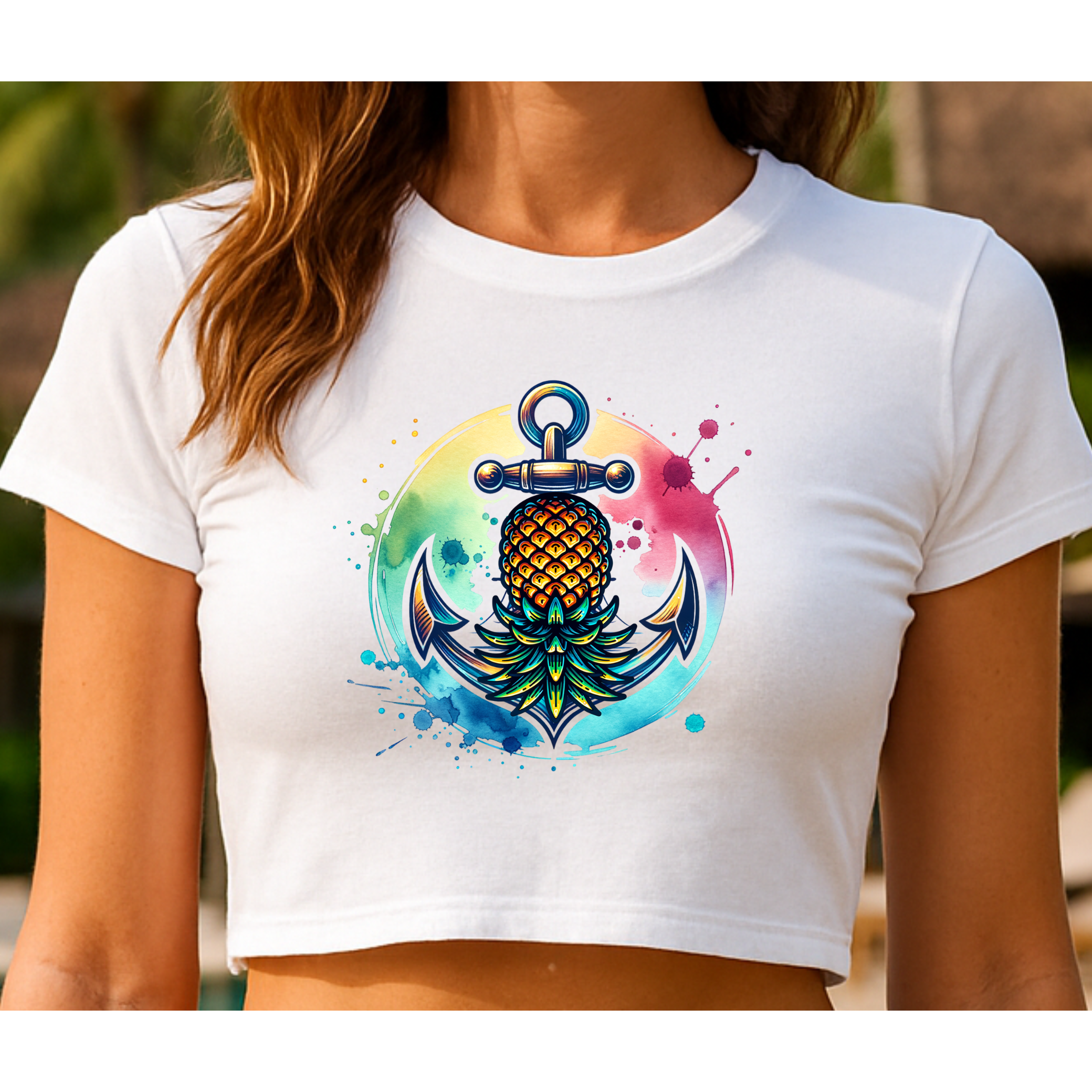 Make waves wherever you go with this white crop top featuring a vibrant upside-down pineapple and anchor design. Perfect for vacations, cruises, or poolside parties, this playful shirt combines comfort and bold personality in one stunning look.