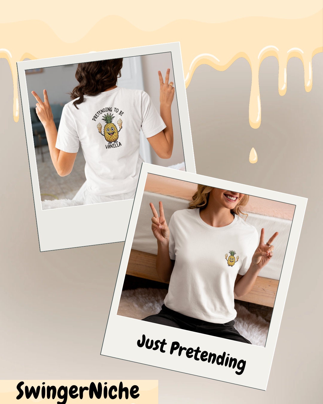A bold Pretending to Be Vanilla designed t-shirt! Featuring eye-catching front and back designs, this versatile shirt is perfect for both men and women. Ideal for those embracing the swinger lifestyle, this tee is a must-have statement piece. Express yourself confidently and proudly with this one-of-a-kind graphic tee. Show off your bold personality and passion for the swinger lifestyle with this attention-grabbing tee.