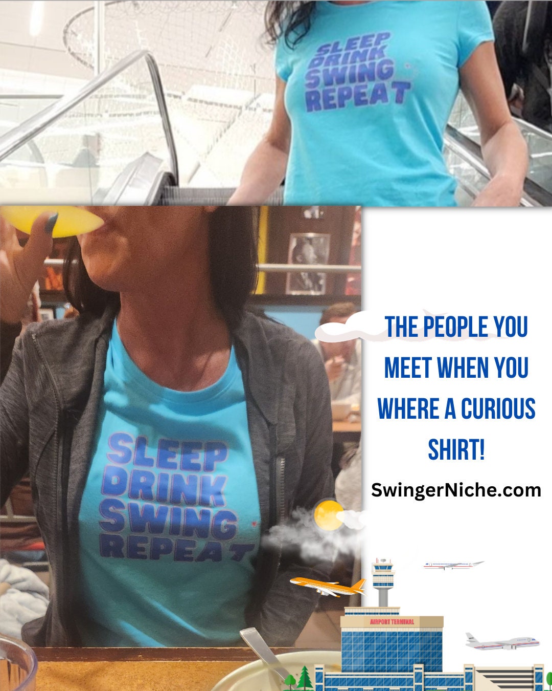 We were at the airport and our flight was delayed so we stopped to eat and met a woman sitting at the table beside us. She asked. "I'm curious about your shirt. What does it mean?" I continued to say, it's about swingers. She asked, "So the upside down pineapple image is a real thing?" My husband and I had a great conversation with an amazing open-minded woman who kept us entertained for an hour. Try wearing a swinger shirt in public and see what happens. Maybe you will also meet more open-minded people.