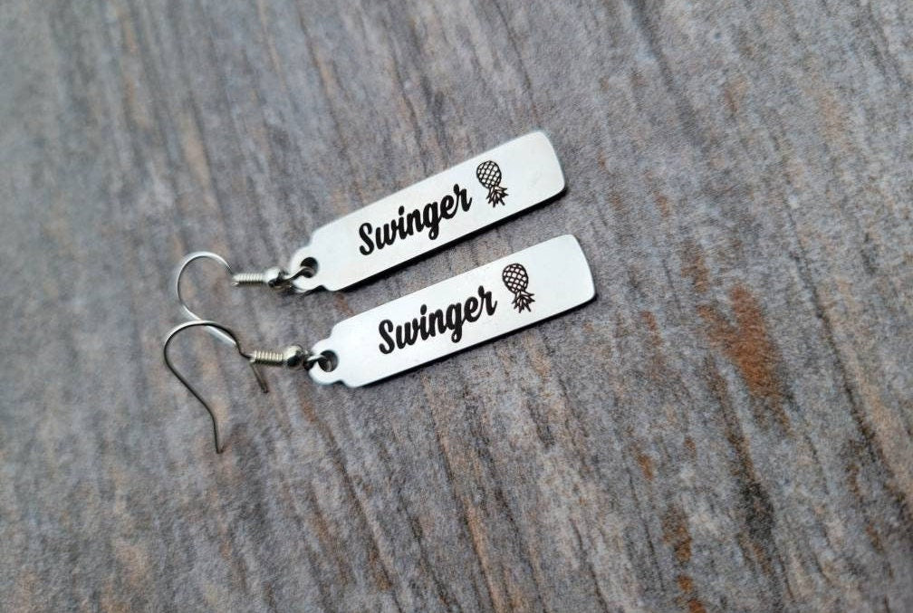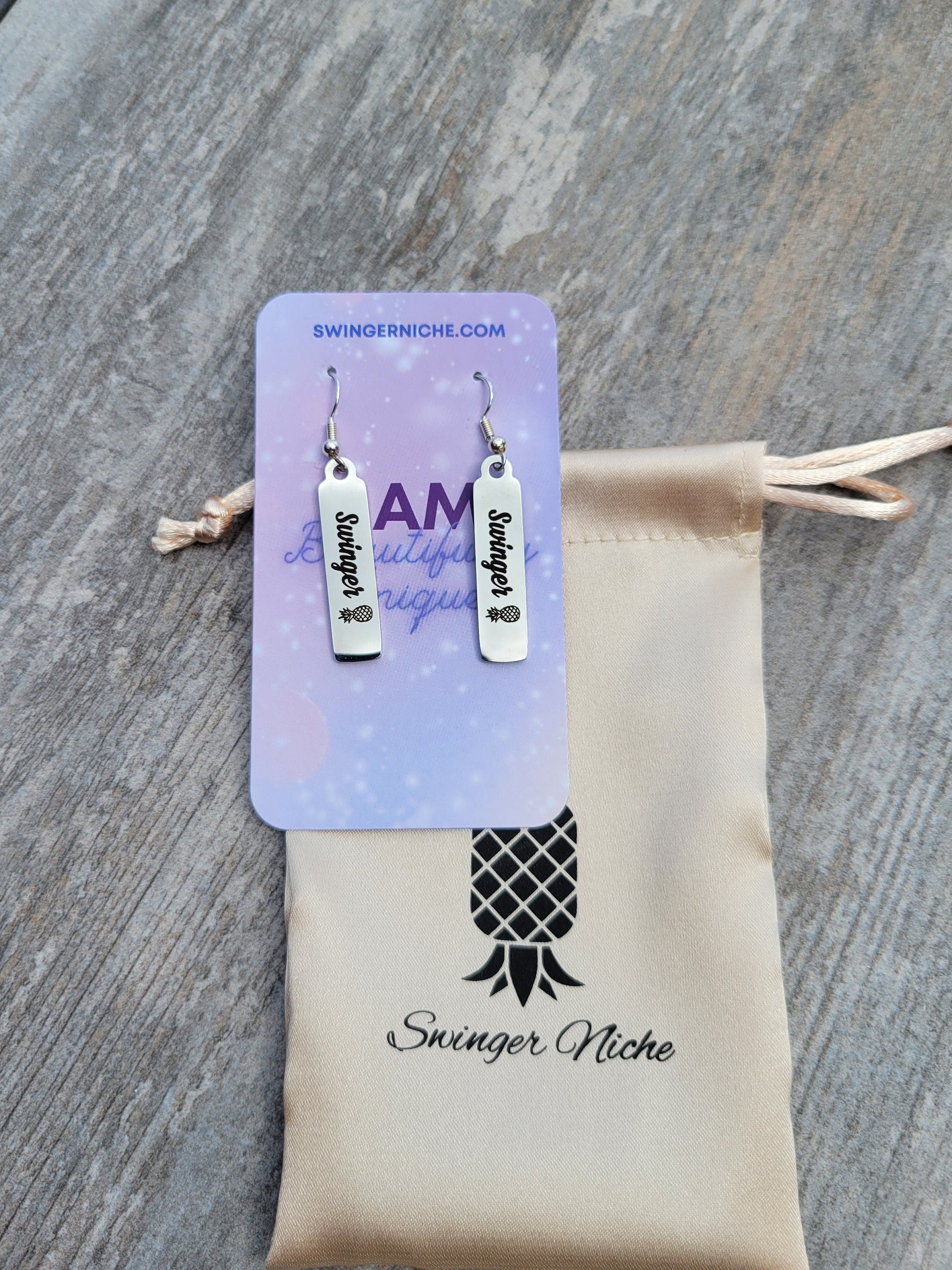These are simple, dainty, and rectangular swinger lifestyle earrings in stainless steel. They are have the statement "Swinger" with an upside-down pineapple for the perfect alternative lifestyle gift or for your own uniqueness.