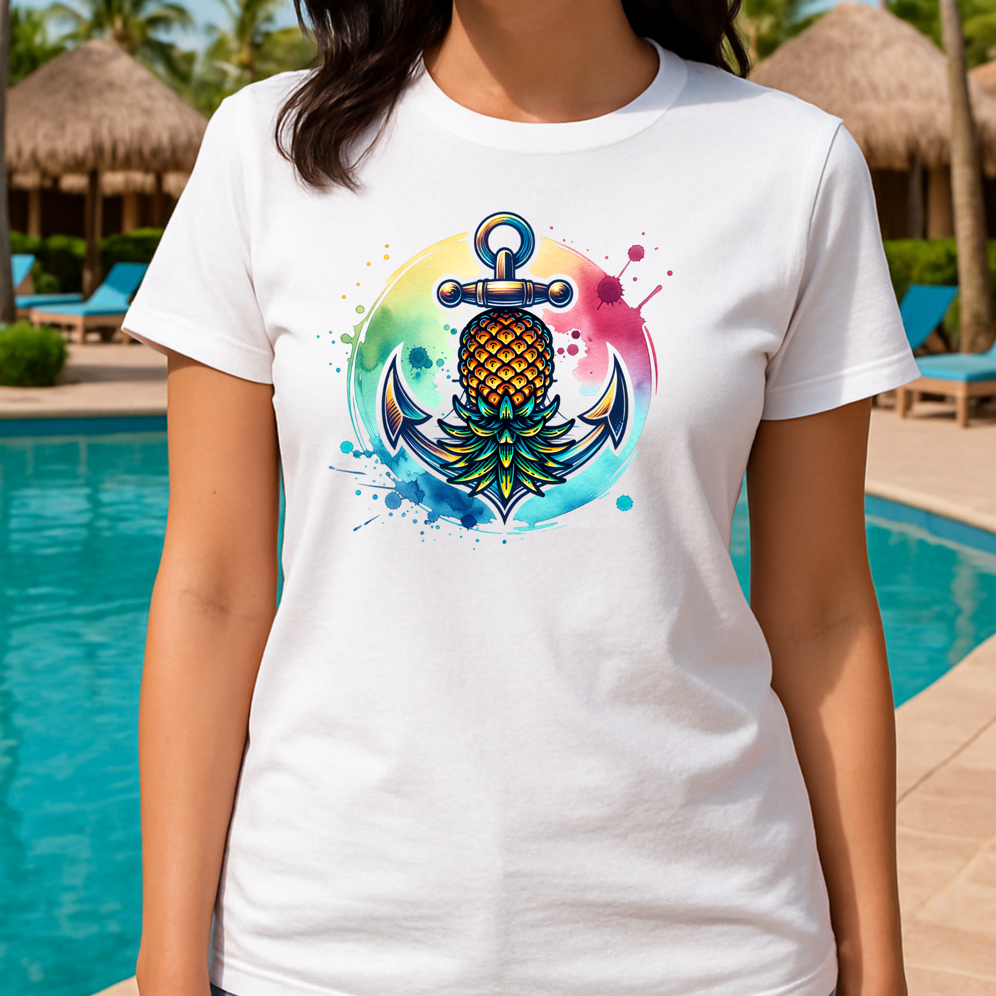 This vibrant tropical pineapple anchor shirt is your go-to for bold, carefree style. Featuring a rainbow splash background and detailed upside-down pineapple inside an anchor, it’s perfect for cruises, vacations, or making a statement. Designed for comfort and printed on a premium white tee, it's a must-have for anyone embracing tropical vibes and unique self-expression.