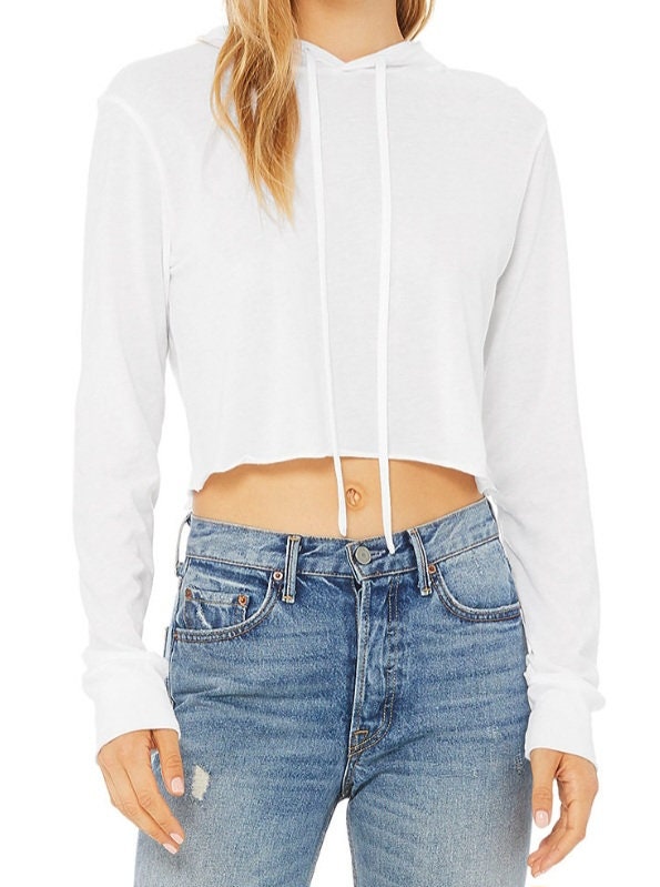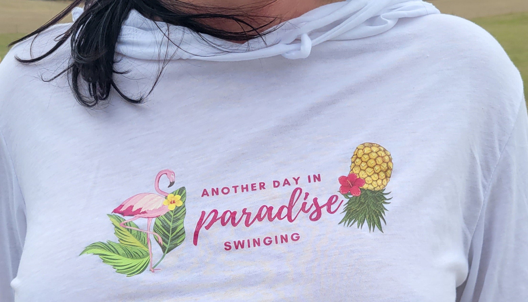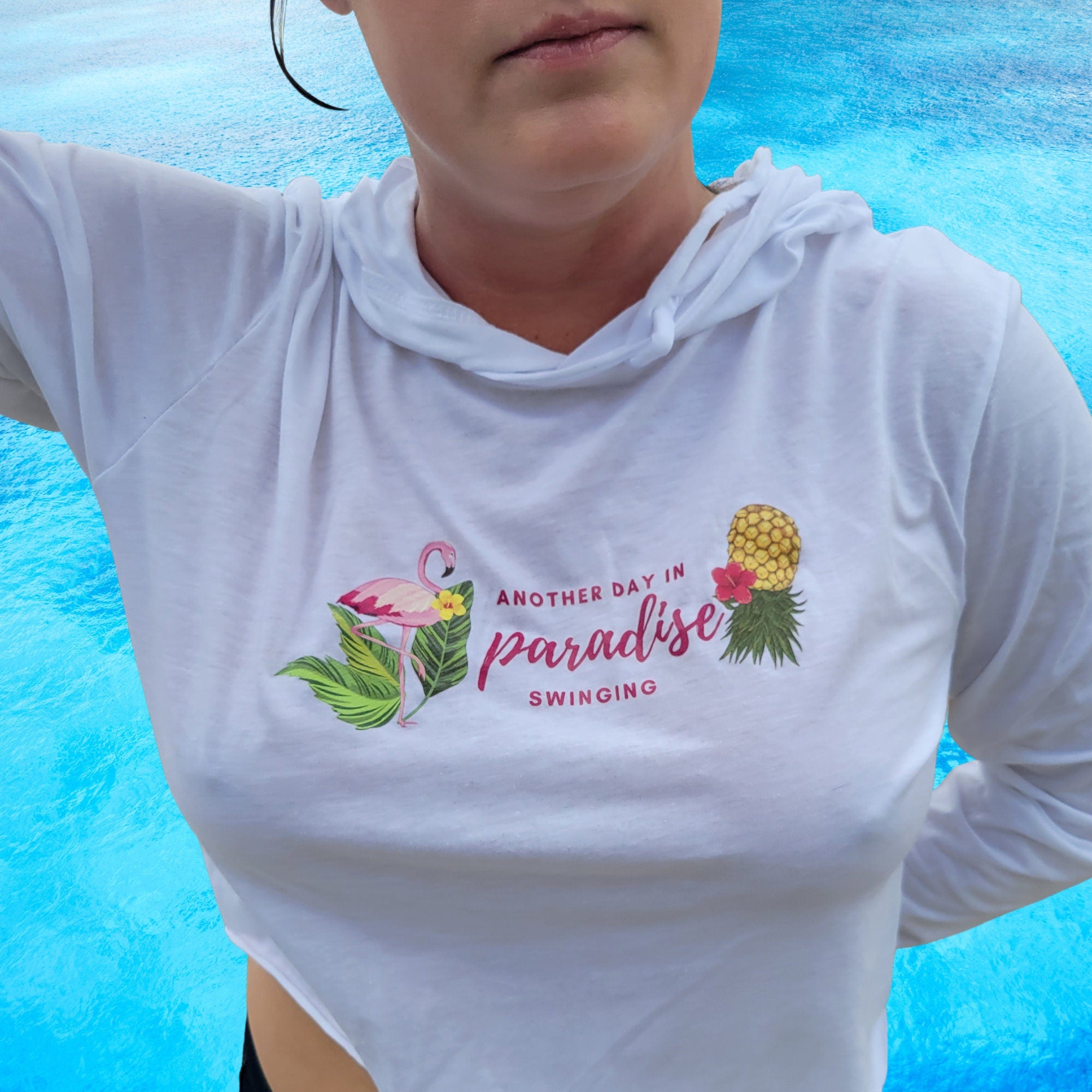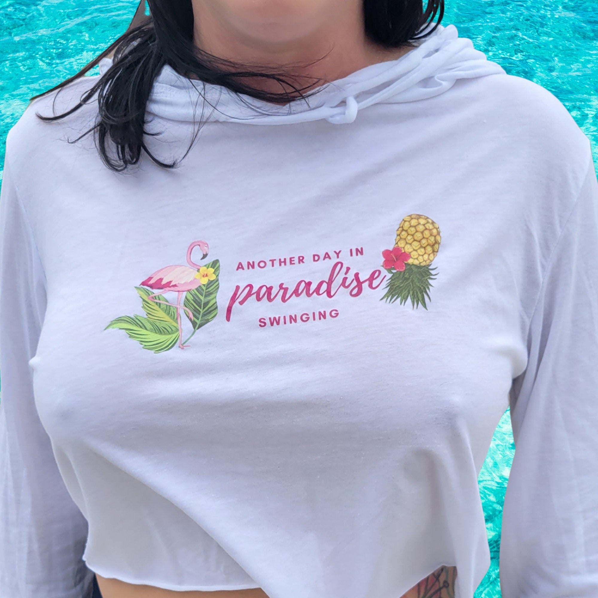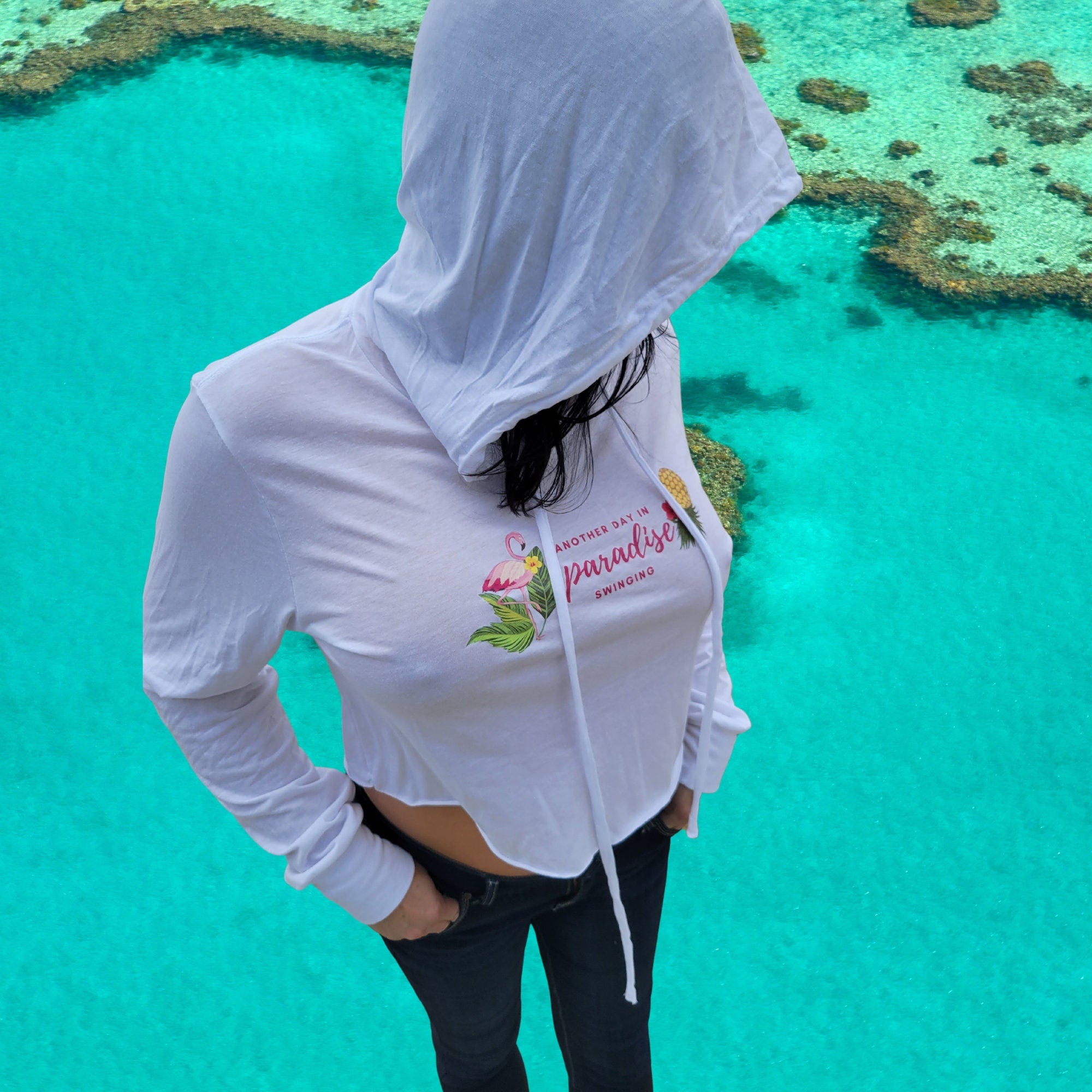 This is a women's medium size white cropped hoodie with the flamingo and upside-down pineapple tropical pattern with the statement "Another Day In Paradise Swinging".