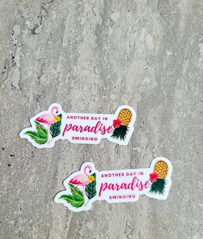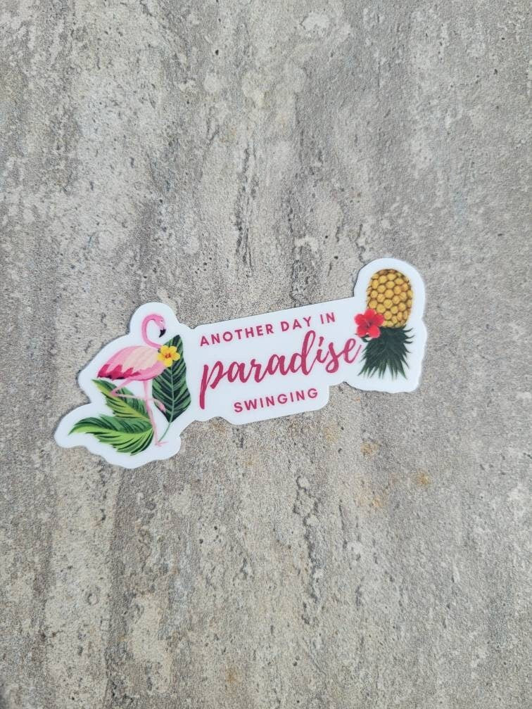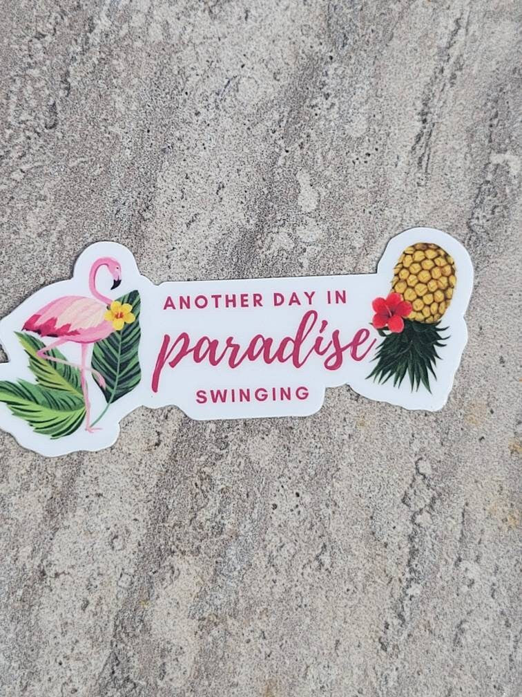 This sticker shows the pink flamingo, the upside-down pineapple, and the statement " Another Day In Paradise Swingng ".