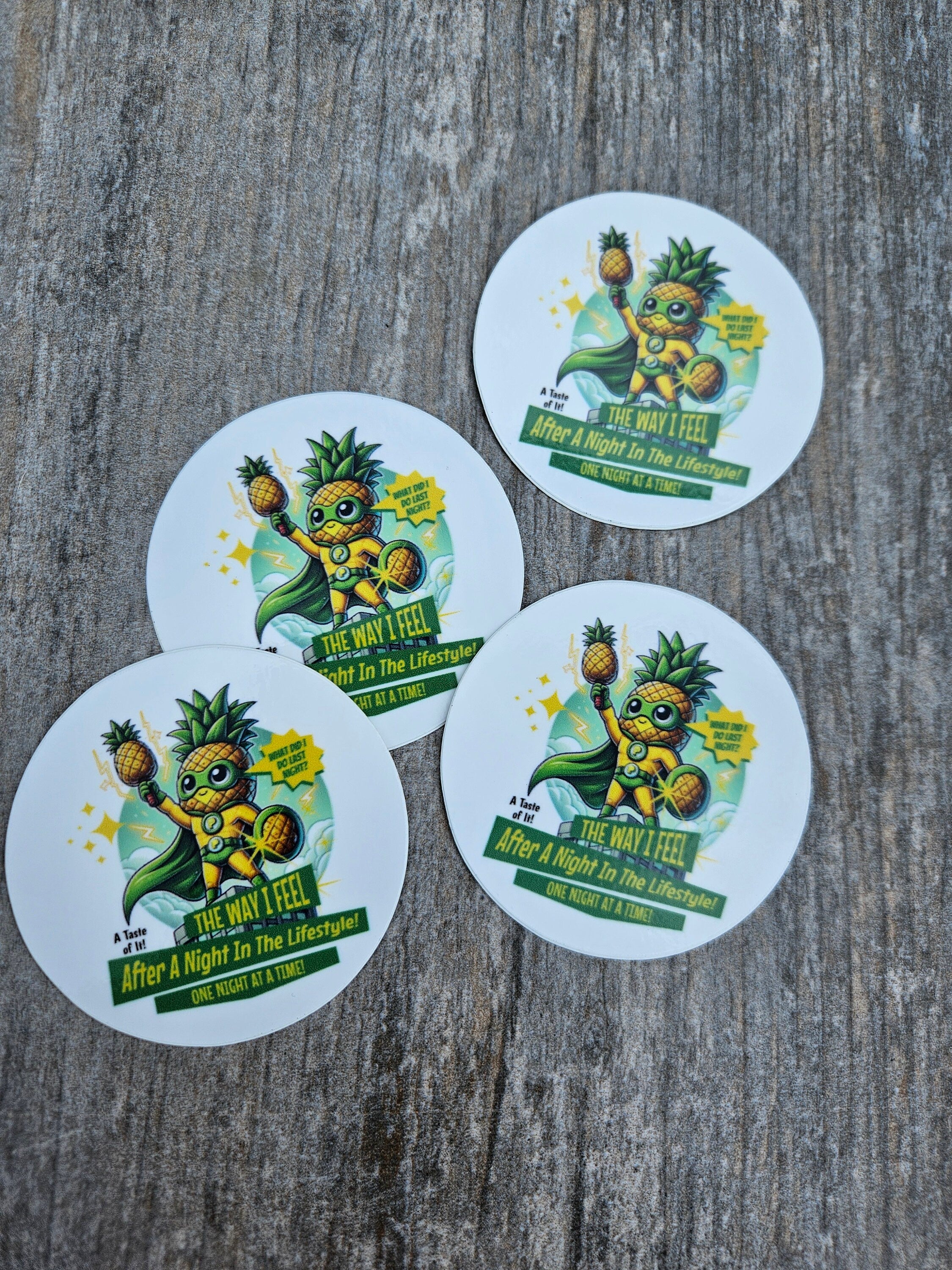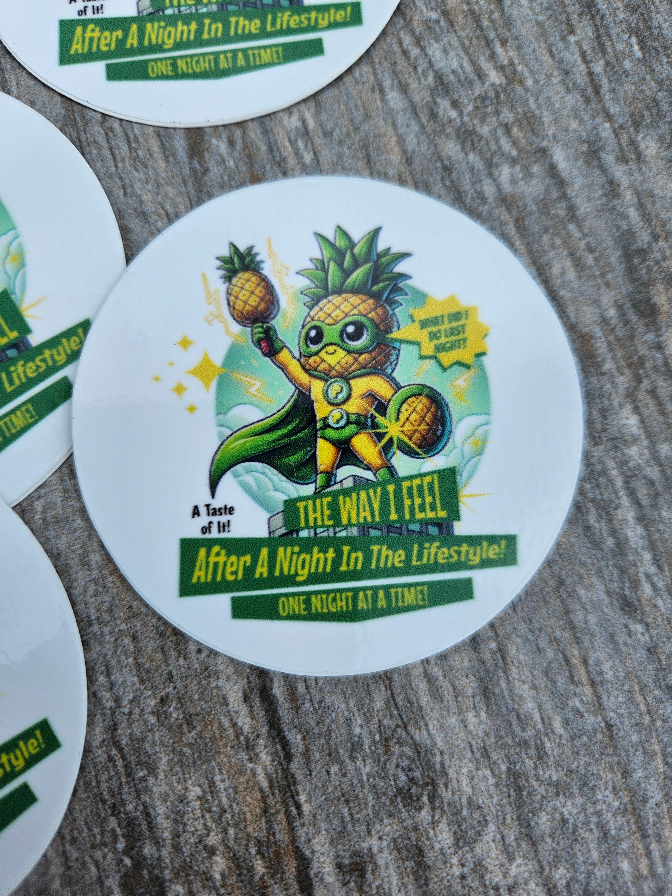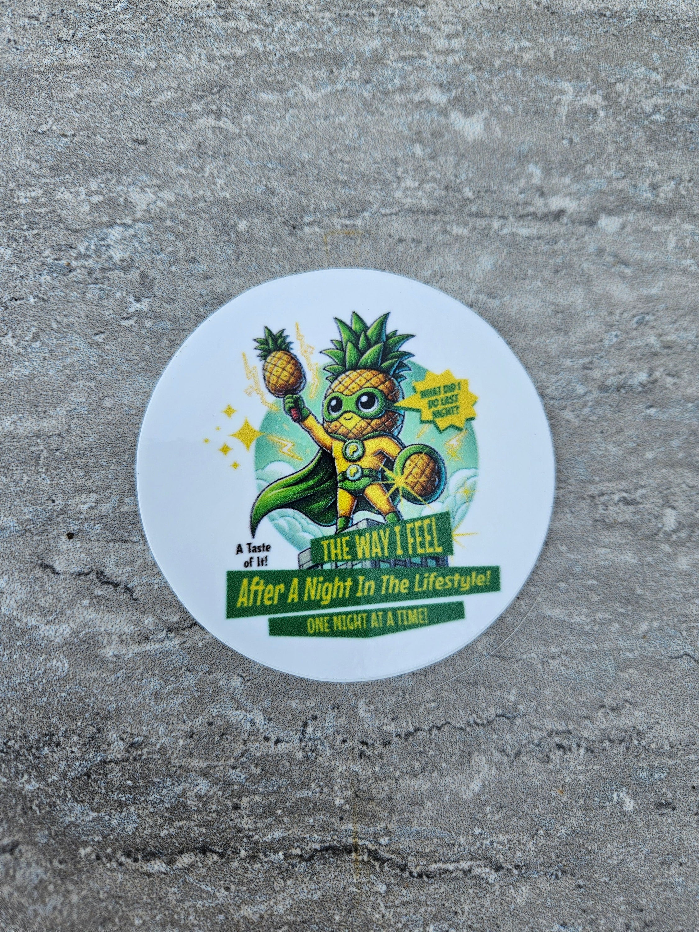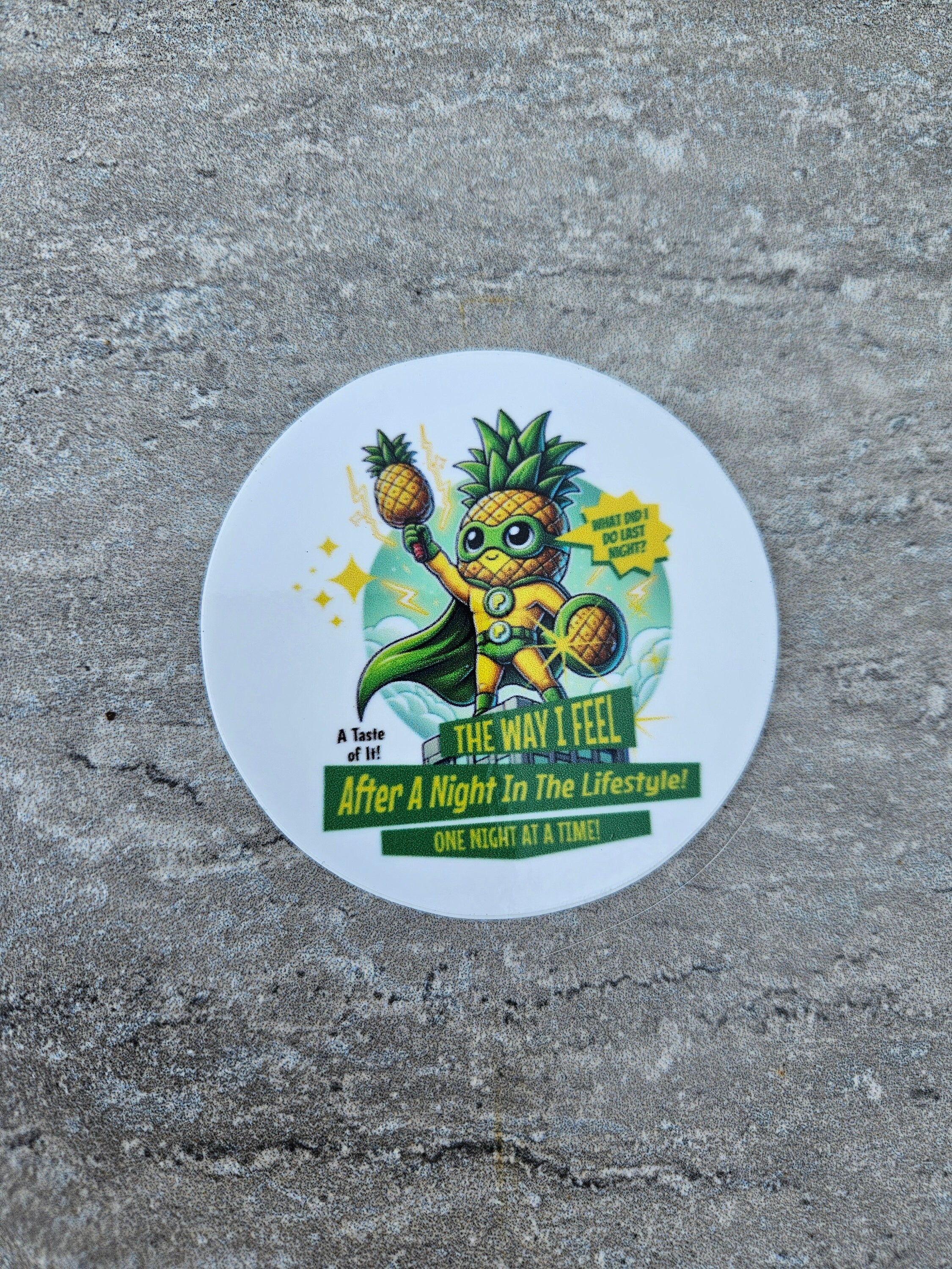 Bring the excitement of a night in the swinger lifestyle to your everyday adventures with this fun and unique super hero pineapple sticker! This quirky design features a pineapple holding a pineapple trophy, adding a touch of whimsy to your favorite belongings. Perfect for decorating laptops, water bottles, notebooks, and more, this sticker is sure to be a conversation starter wherever you go. Add a pop of personality to your belongings with this playful and eye-catching sticker!