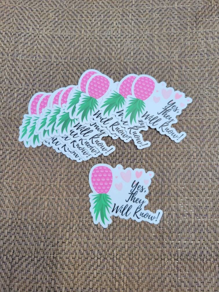 Yes, They Will Know sticker for the Swinger lifestyle. A pink upside down pineapple with hearts sticker for tumblers, Durable and Thick