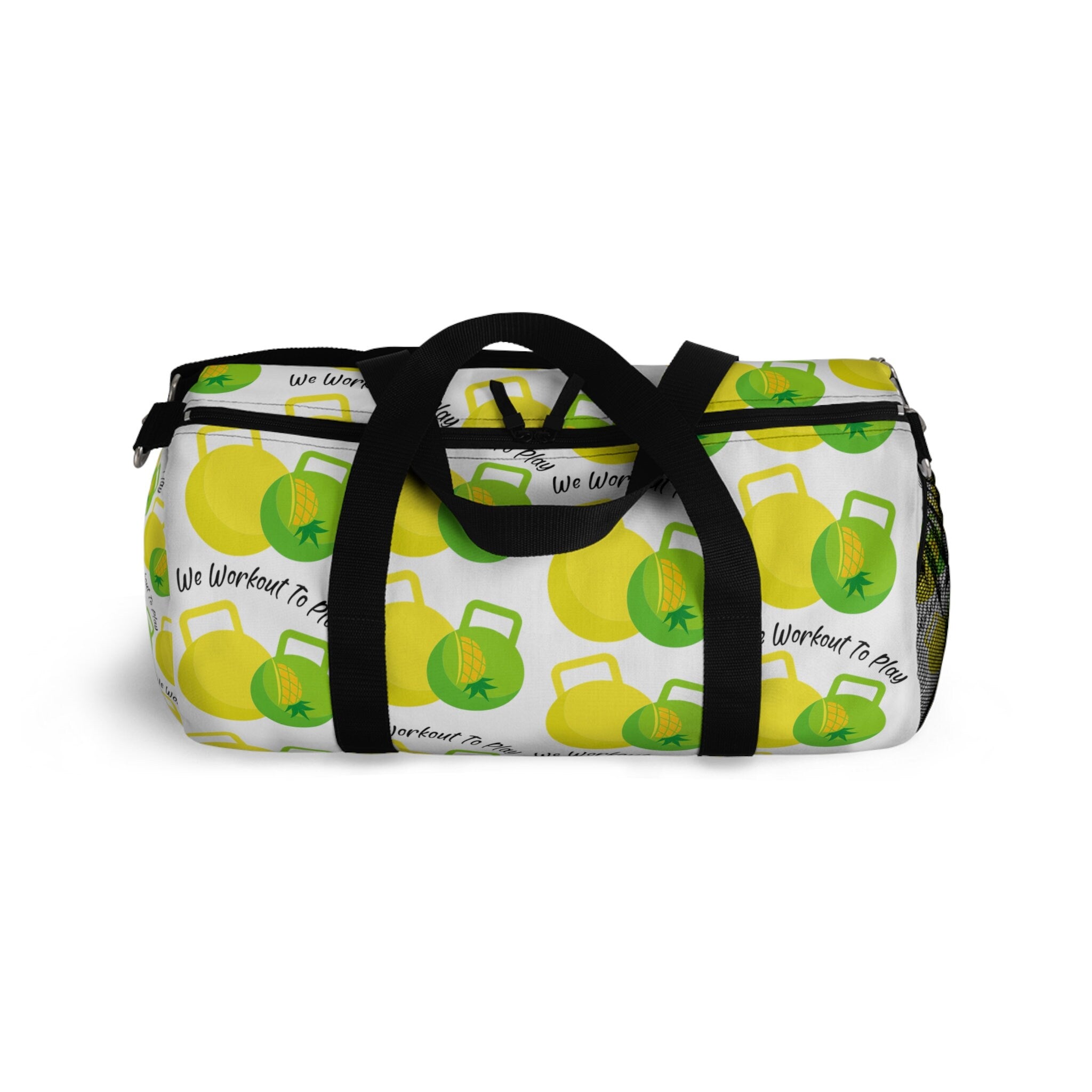 Introducing our unique Workout To Play duffel gym bag, designed with a fun twist for the swinger lifestyle - upside down pineapples! Stand out at the gym or while on the go with this stylish and playful bag that perfectly combines fitness and play. With its spacious interior and practical compartments, you can easily pack all your essentials for a workout session or a fun day out. Whether you're hitting the gym or heading to a swinger event, this duffel bag is sure to turn heads and make a statement. Upgrade your accessories with our one-of-a-kind duffel gym bag today!