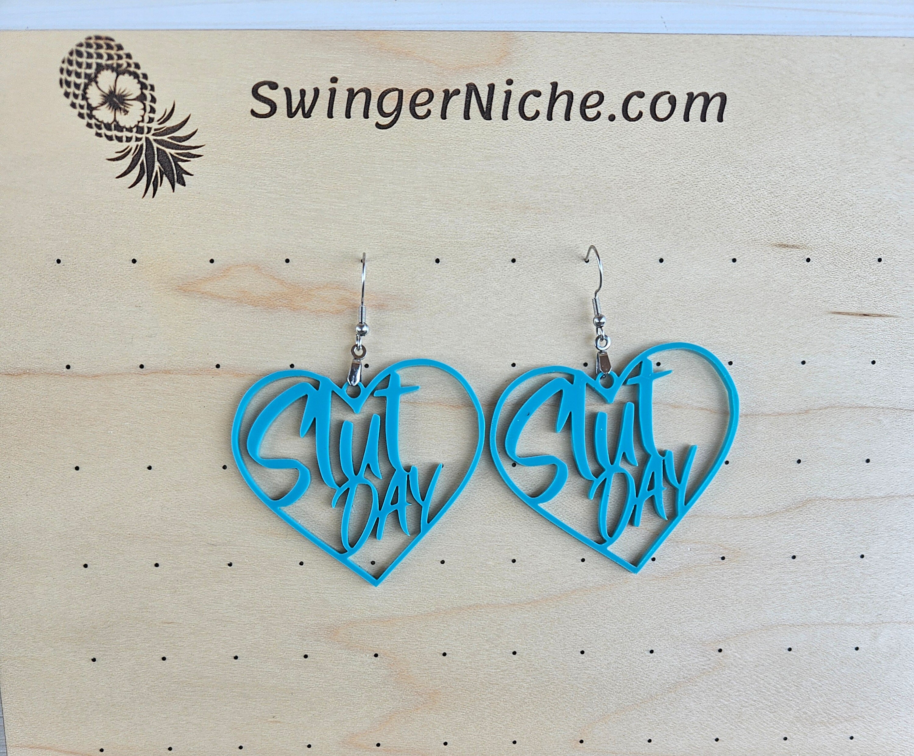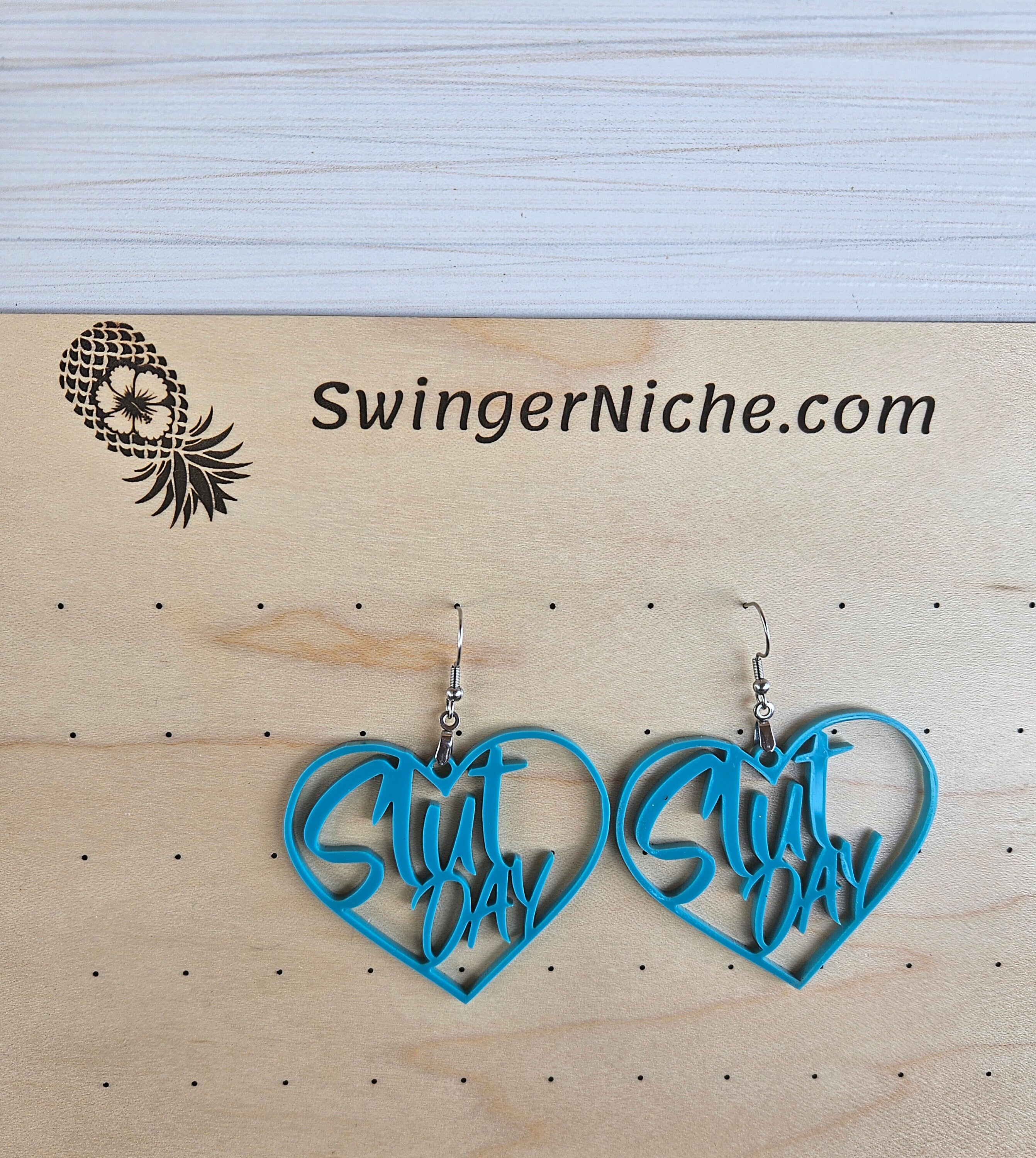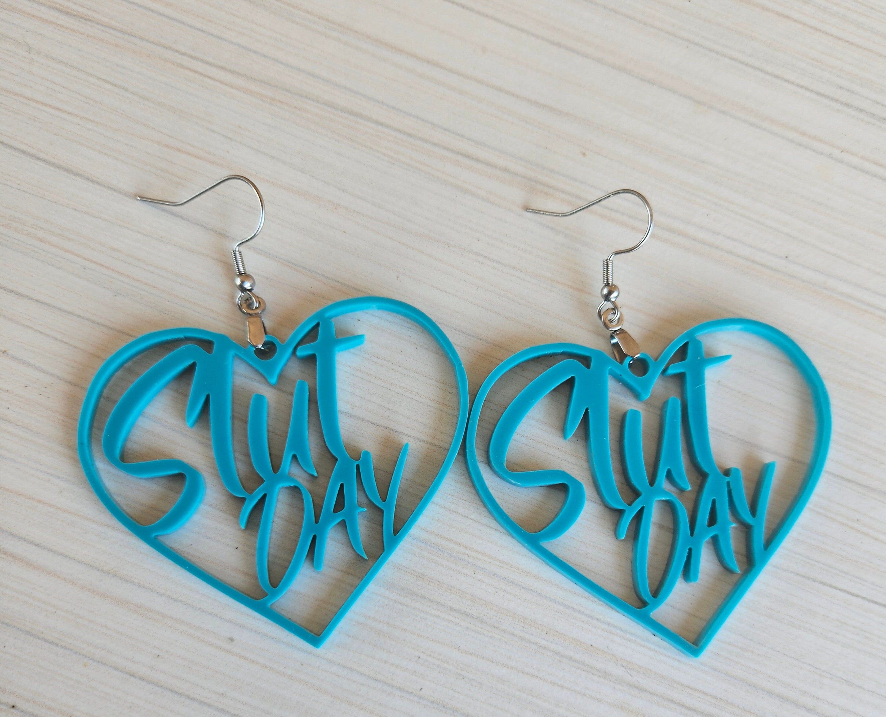 Add a pop of bold color to your outfit with these Slut Day Aqua Dangle Earrings! These eye-catching earrings are sure to make a statement wherever you go. Handcrafted with love and attention to detail, these earrings are perfect for adding a touch of fun and flair to your look. Stand out from the crowd with these vibrant and playful accessories!