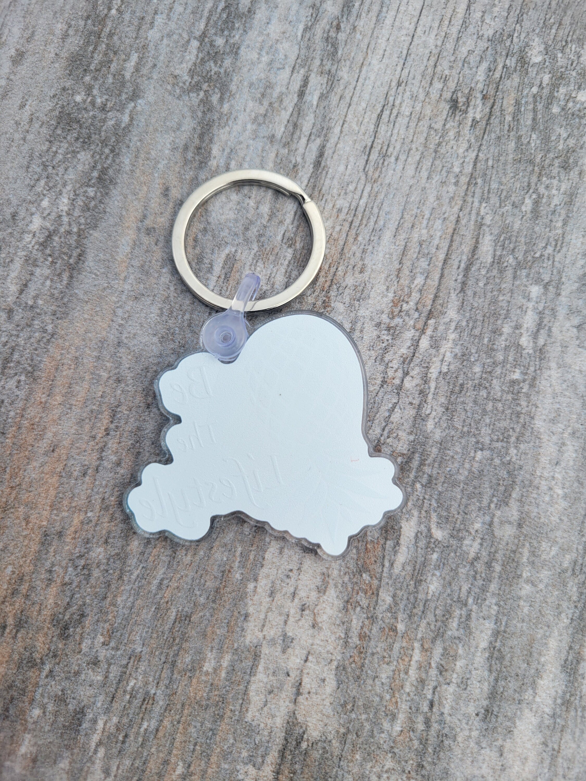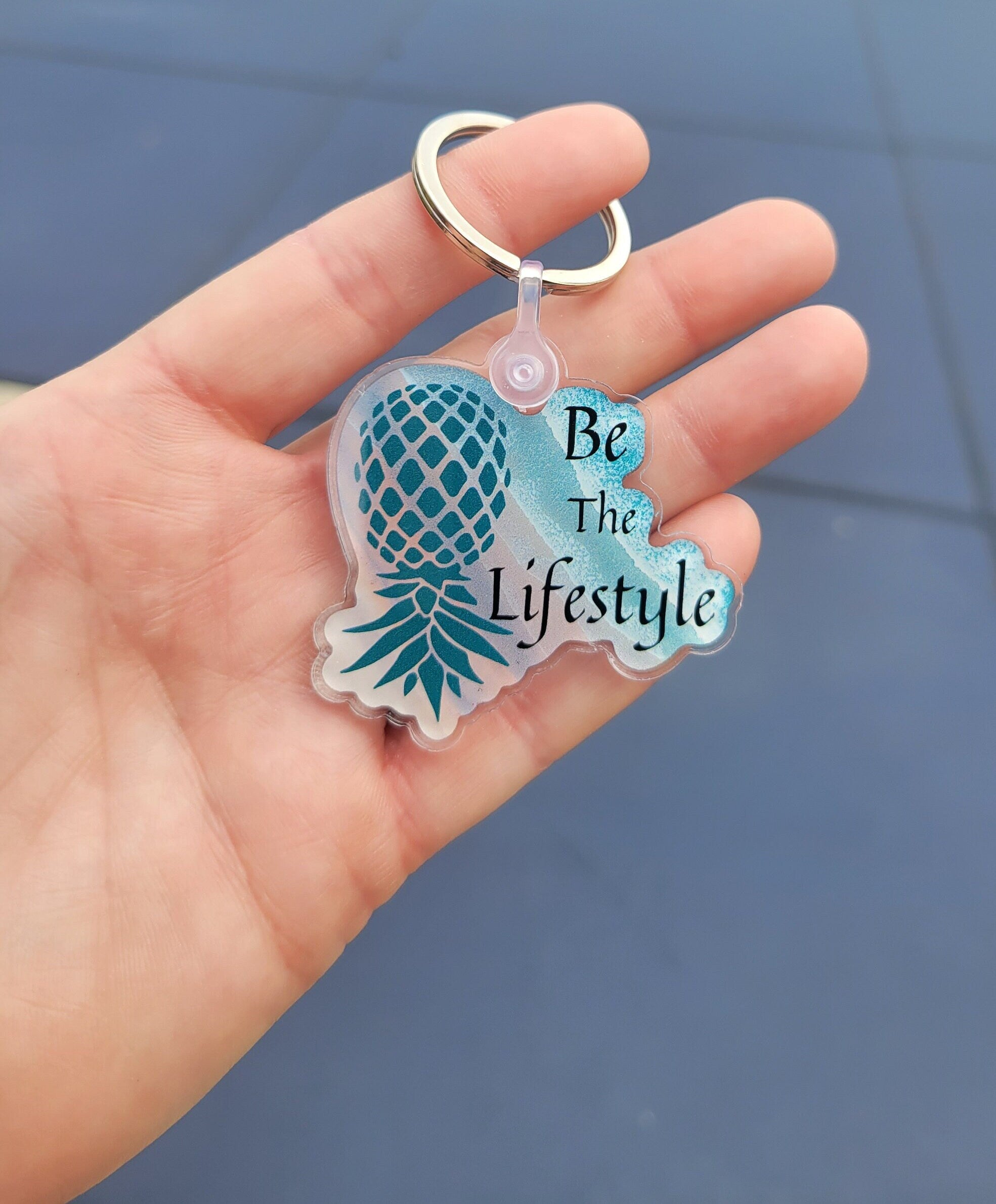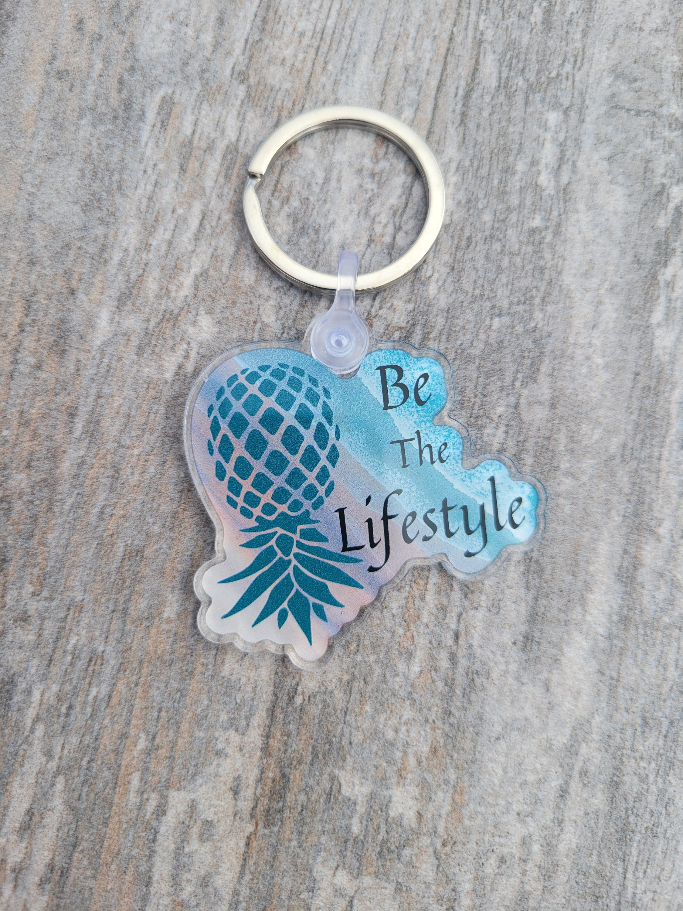 The background of the keychain features a beautiful beach scene, complete with sand and waves, creating a relaxing and serene ambiance. The upside-down pineapple is positioned to the left of the words "Be The Lifestyle",adding a touch of whimsy and fun to the design.
