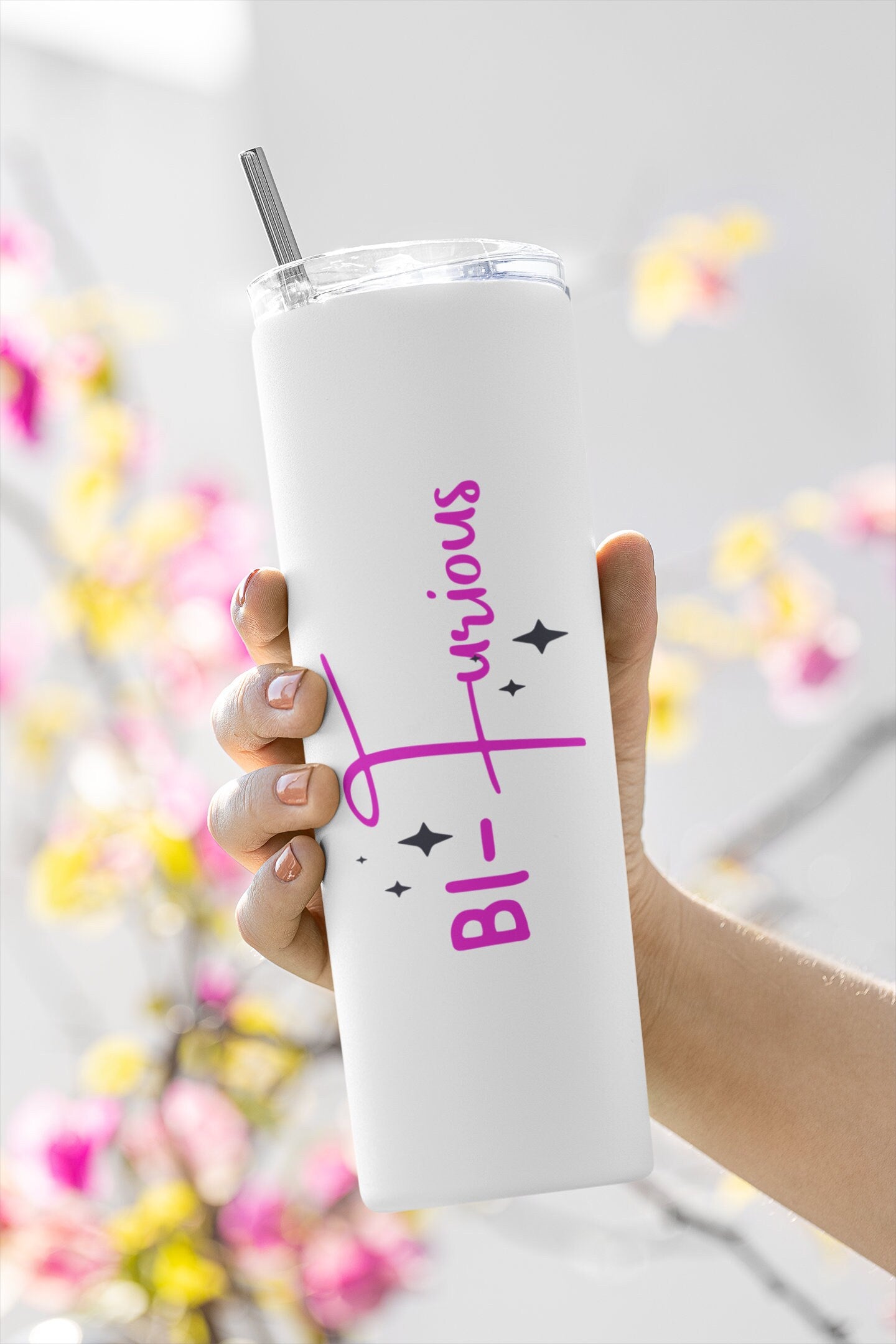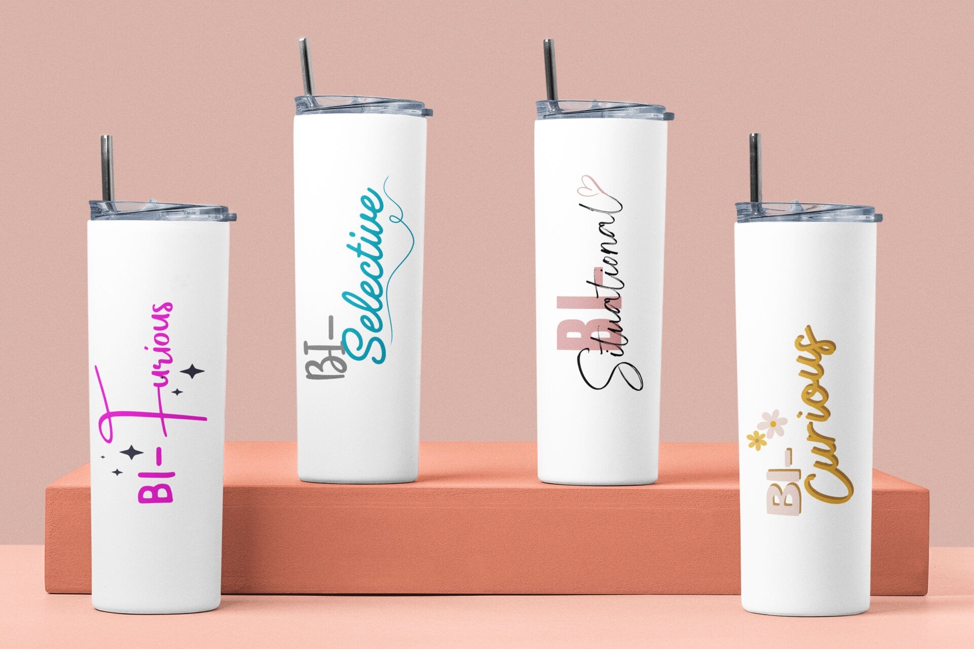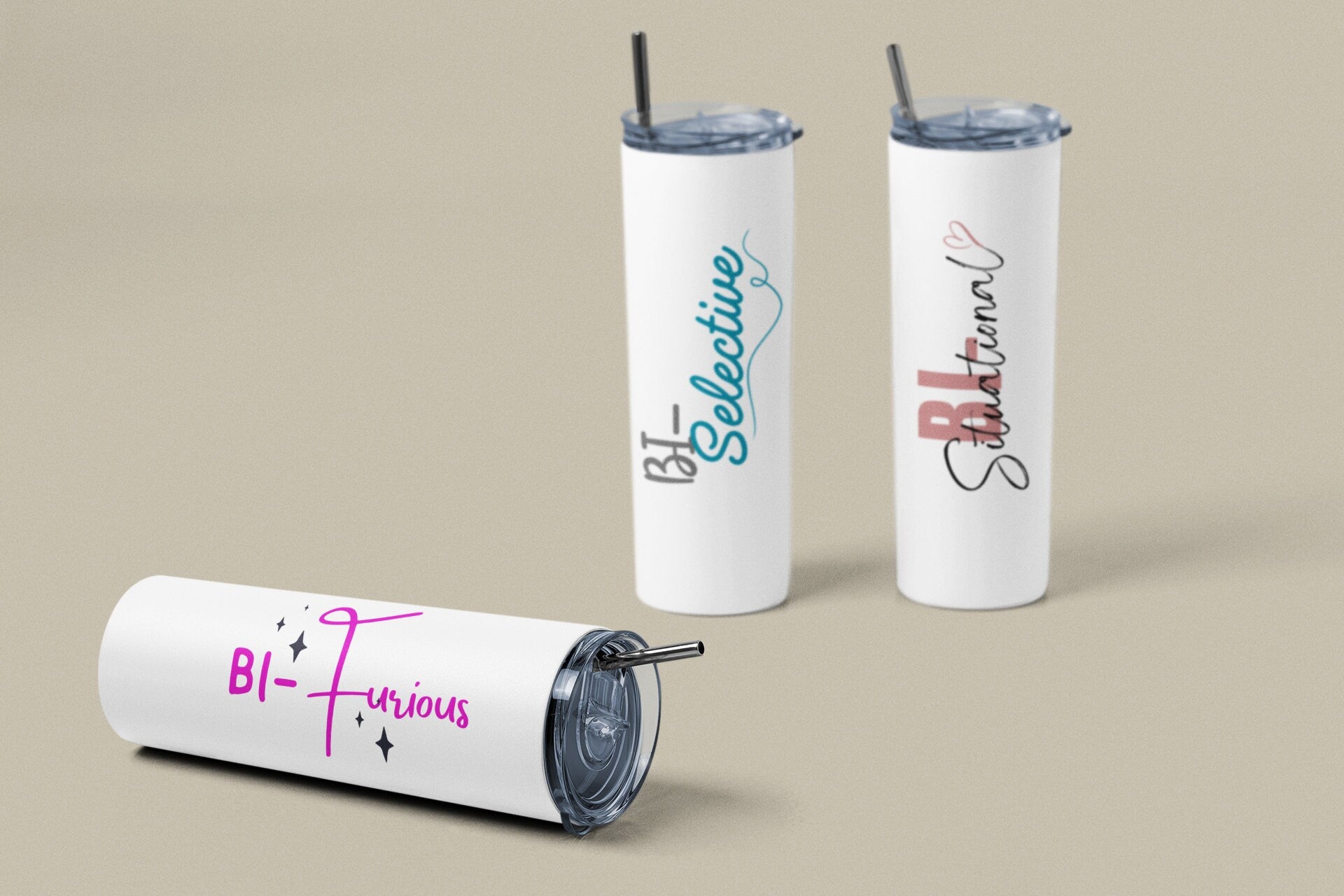 Add a pop of color and a touch of personality with this tumbler, personalized or not. This collection of tumblers feature unique statements: bi curious, bi situational, bi selective, and bi furious. These fun and vibrant stickers are perfect for showing off your LGBTQ lifestyle or adding a playful twist to your swinger lifestyle accessories.