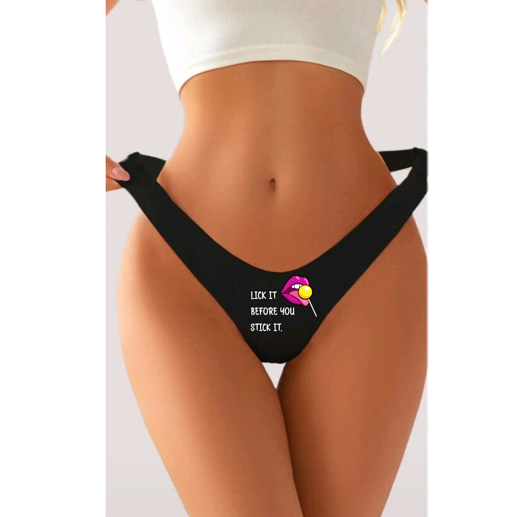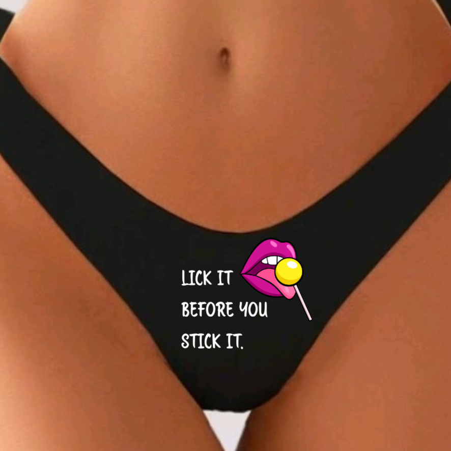 Low-rise "Lick It Before You Stick It" black lingerie thong panty for any occasion.