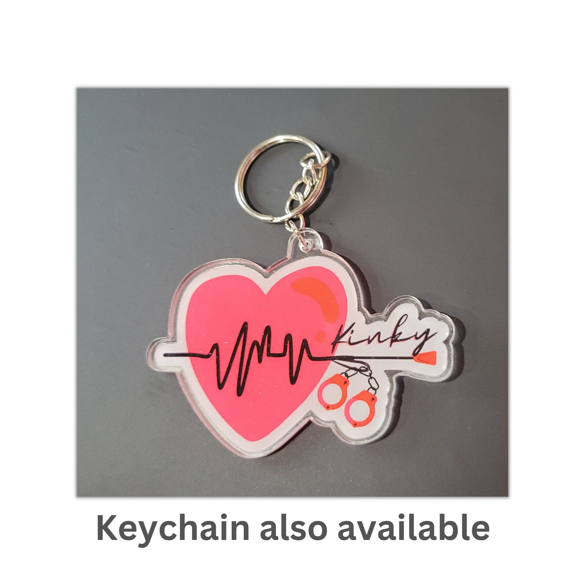 Do you or your partner and friend have a kinky side that you want to share with the world? This sticker states that kinky with a pounding heart, handcuffs, a whip, and the special word "kinky." Give this as a fun kinky gift or keep it for yourself to showcase your kinky side.