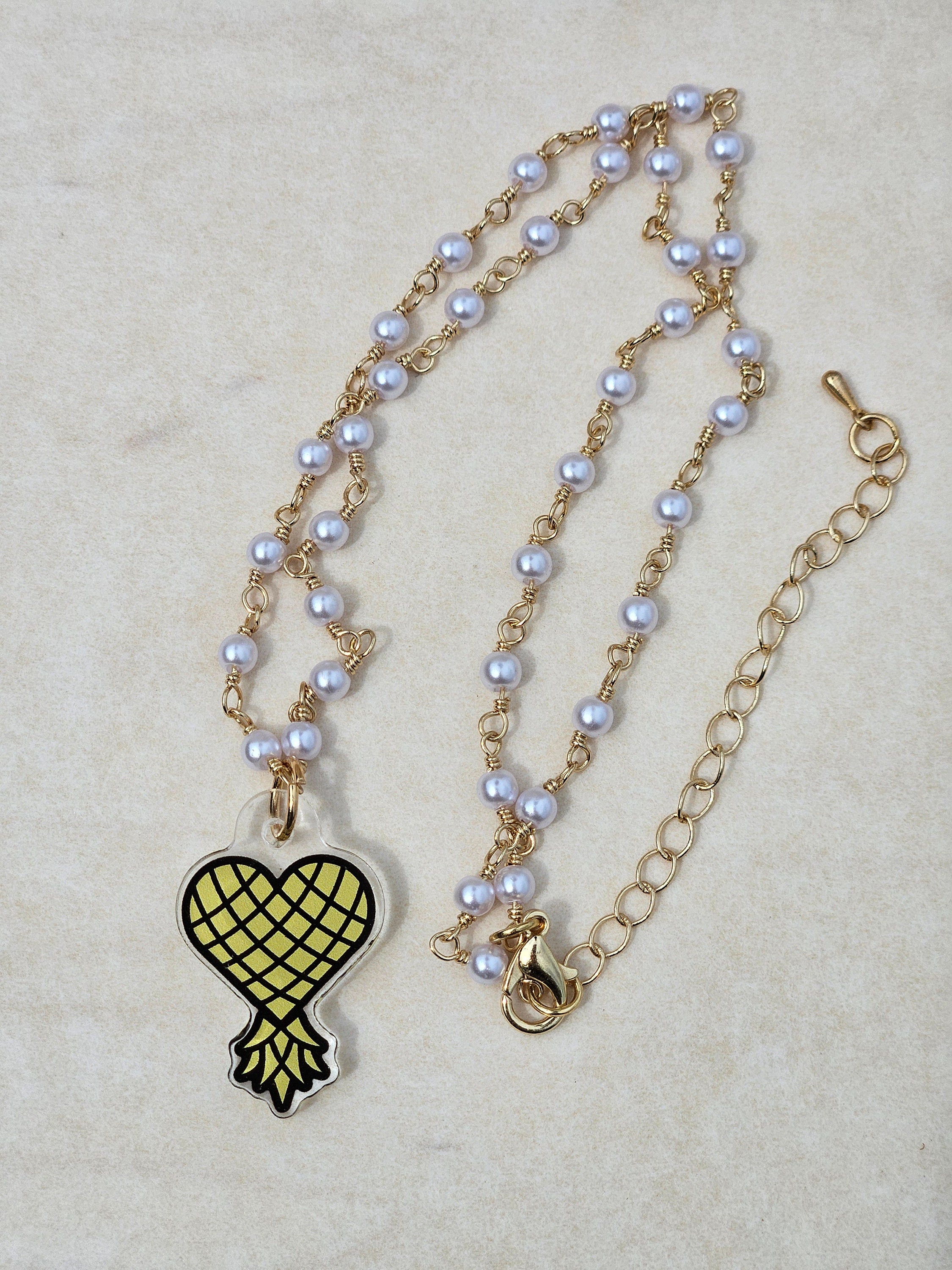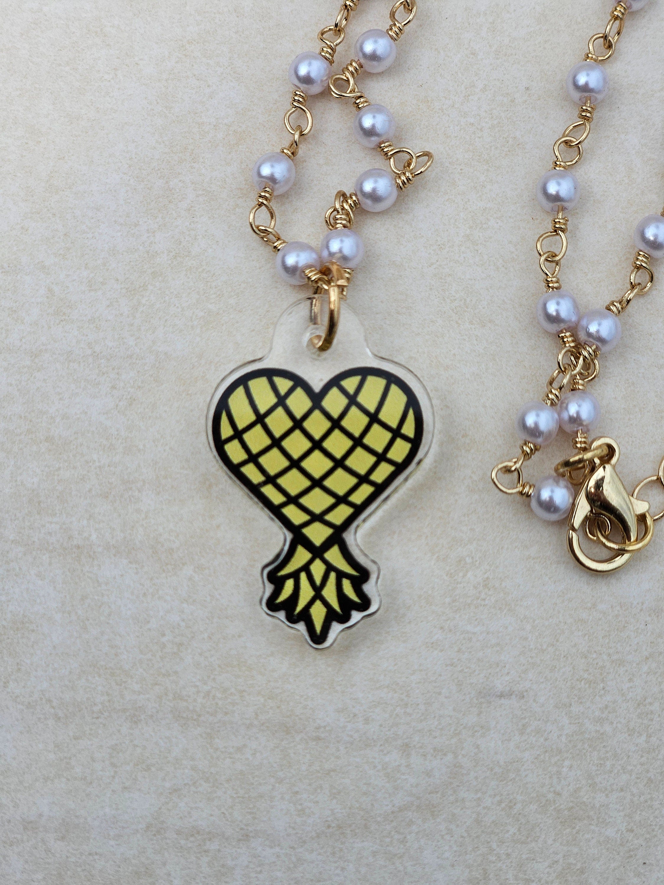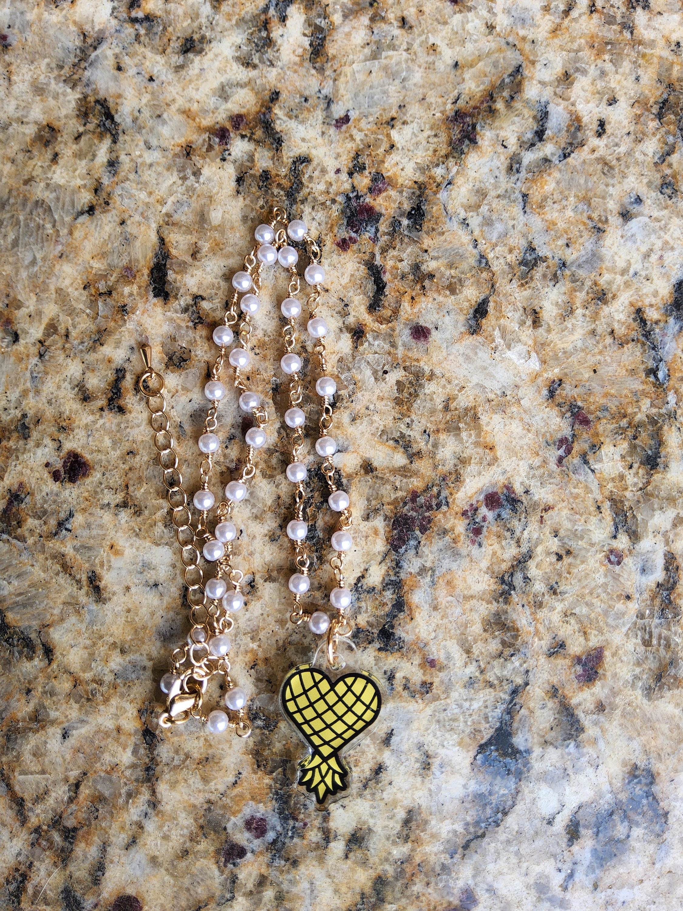 Introducing the Love With A Twist Necklace that brings a modern spin to classic charm jewelry. This unique piece can also be doubled as an anklet, adding versatility to your accessory collection. Adorned with an upside-down pineapple charm on a delicate pearl necklace, this design is perfect for those who love to stand out with a touch of whimsy. Embrace your lifestyle as a swinger with this one-of-a-kind necklace/anklet hybrid that is sure to turn heads wherever you go.