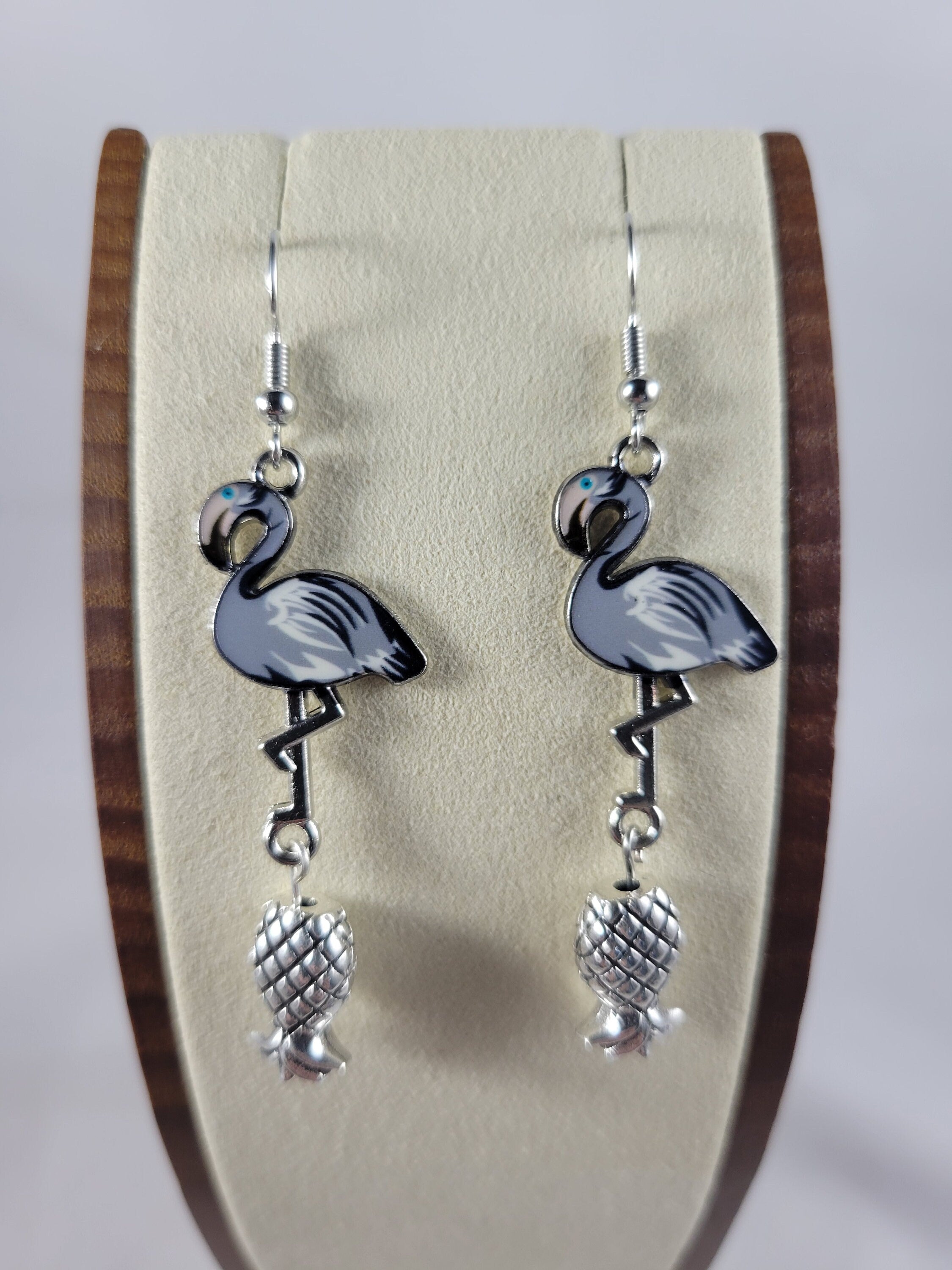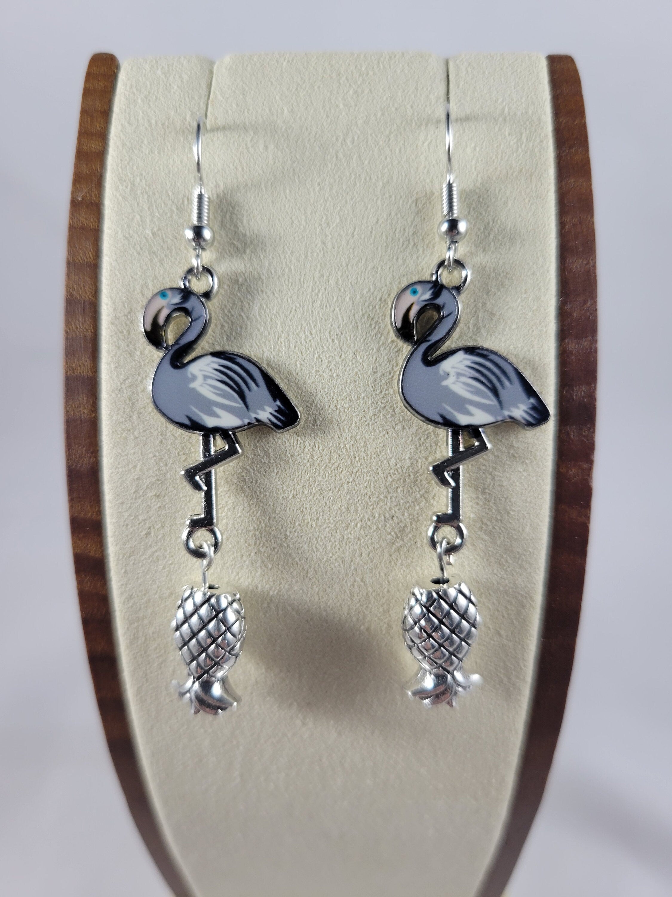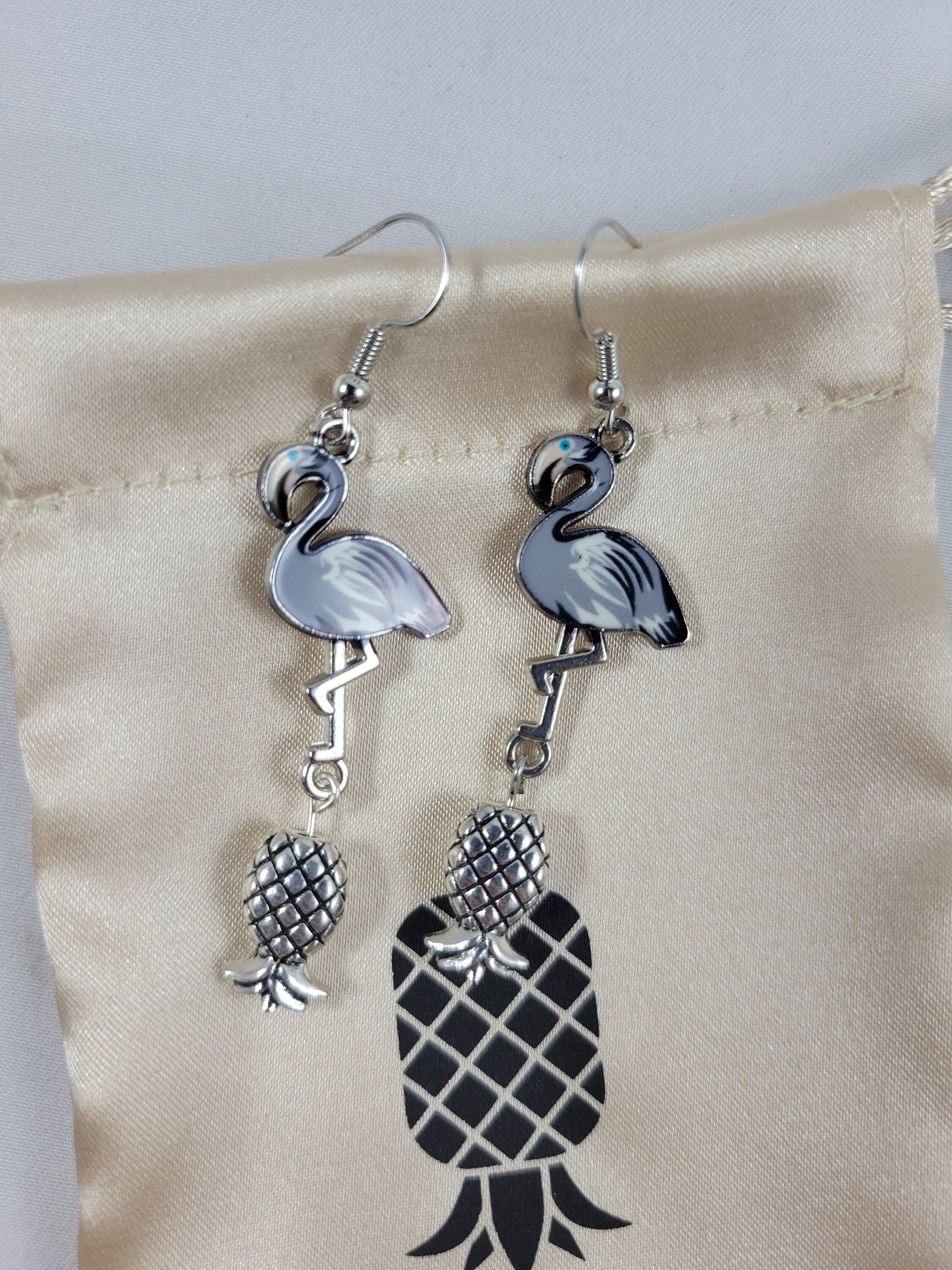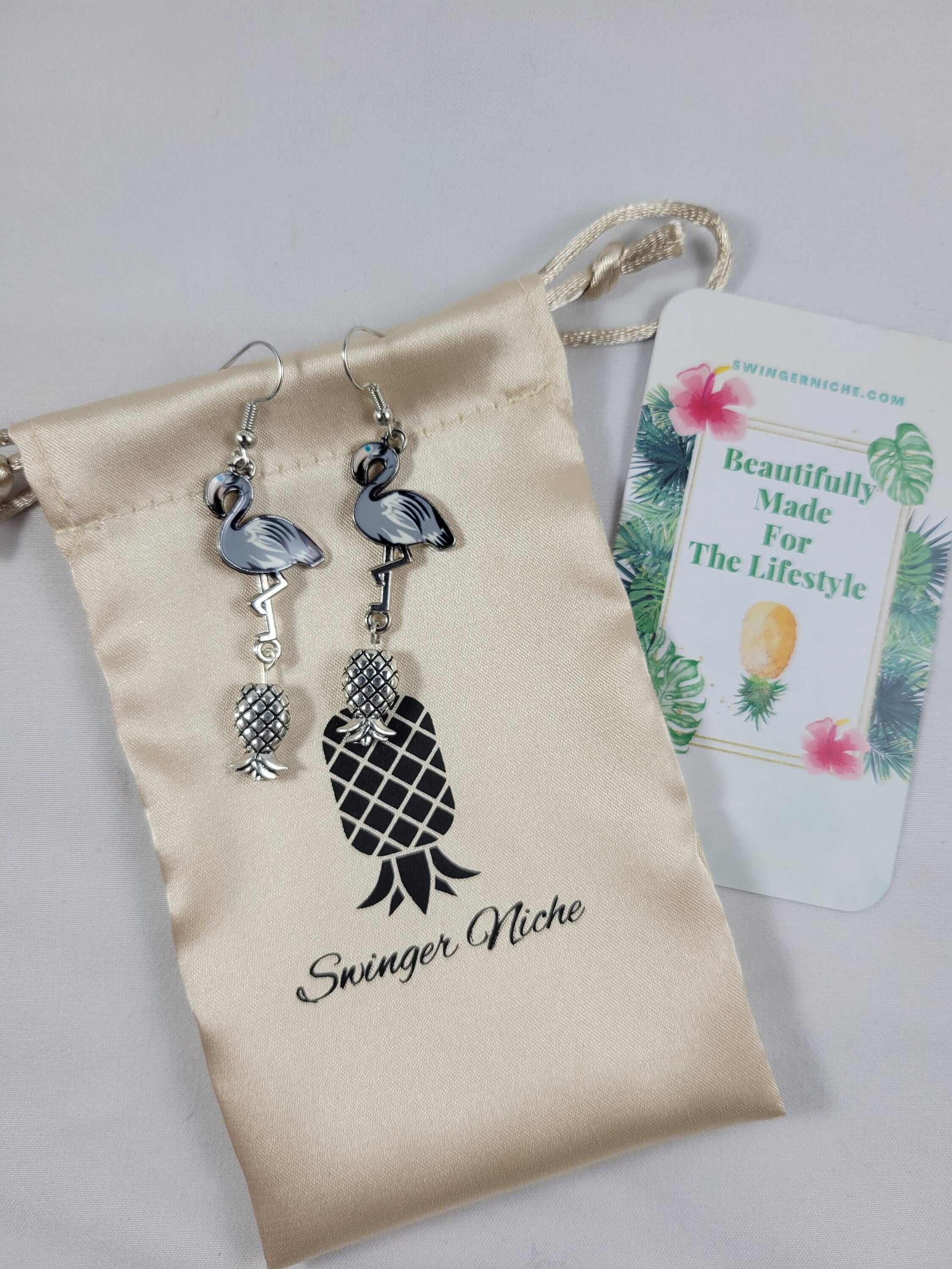Pearl Gray Flamingo and Silver Upside Down Pineapple Earrings, Tropical Summer Earrings, Gift for Her, Swinger Lifestyle Jewelry