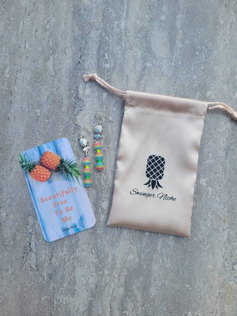 These are a pair of upside-down pineapple earrings with rainbow beads accent for a fun night on the town or a main colorful event. These are great for showcasing the swinger pride and the pride that we share with others in our own and in their lifestyles.