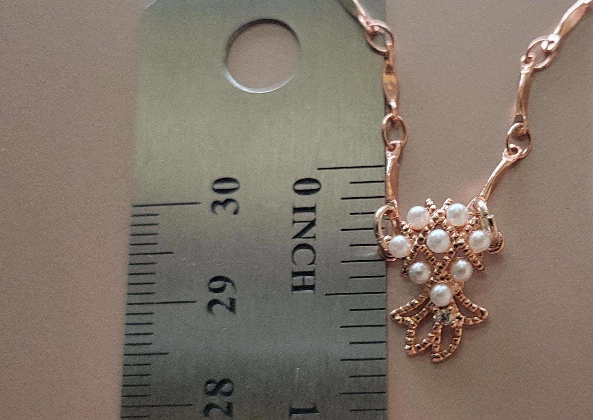 The necklace is a faux pearl, pineapple, and rose gold colored charm on a rose gold necklace. It has a sophisticated and elegant look. This necklace is small in size, making it suitable for everyday wear or as a subtle addition to a date outfit.