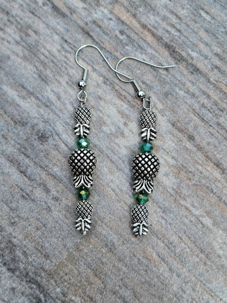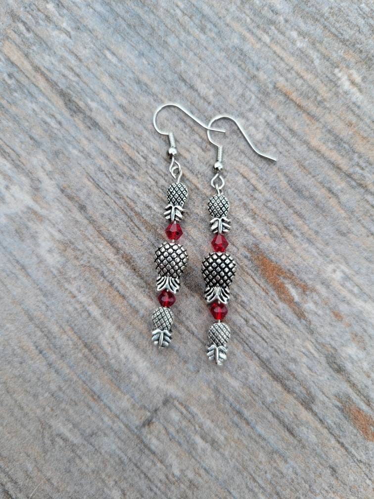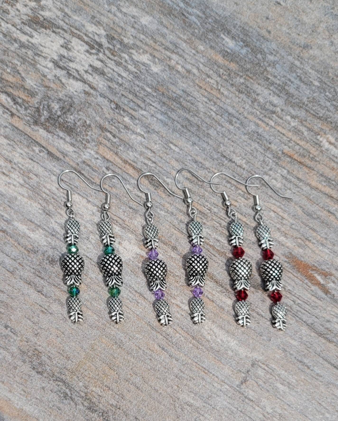 Tri Upside Down Pineapple Earrings, Threesome Earrings, Emerald Green, Ruby Red or Purple Lavender Gemstones, Antique Silver